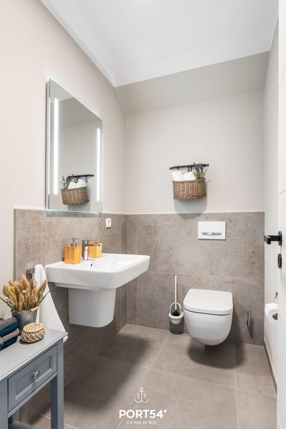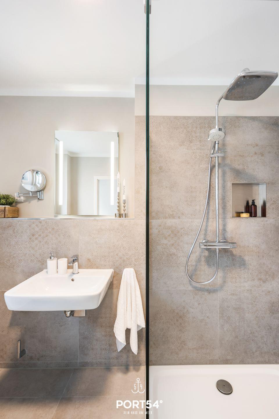 Das Duschbad im Obergeschoss überzeugt durch eine finnische Sauna, eine Badewanne sowie eine große Dusche und ein separates WC. In der finnischen Sauna können Sie sich nach langen Strandspaziergängen herrlich entspannen und dem Alltagsstress entfliehen. Im Badezimmer im Erdgeschoss bietet eine zweite Dusche eine durchdachte räumliche Trennung zum unteren Schlafzimmer.