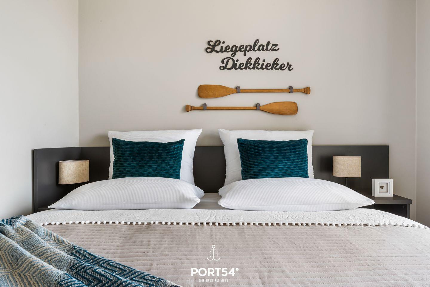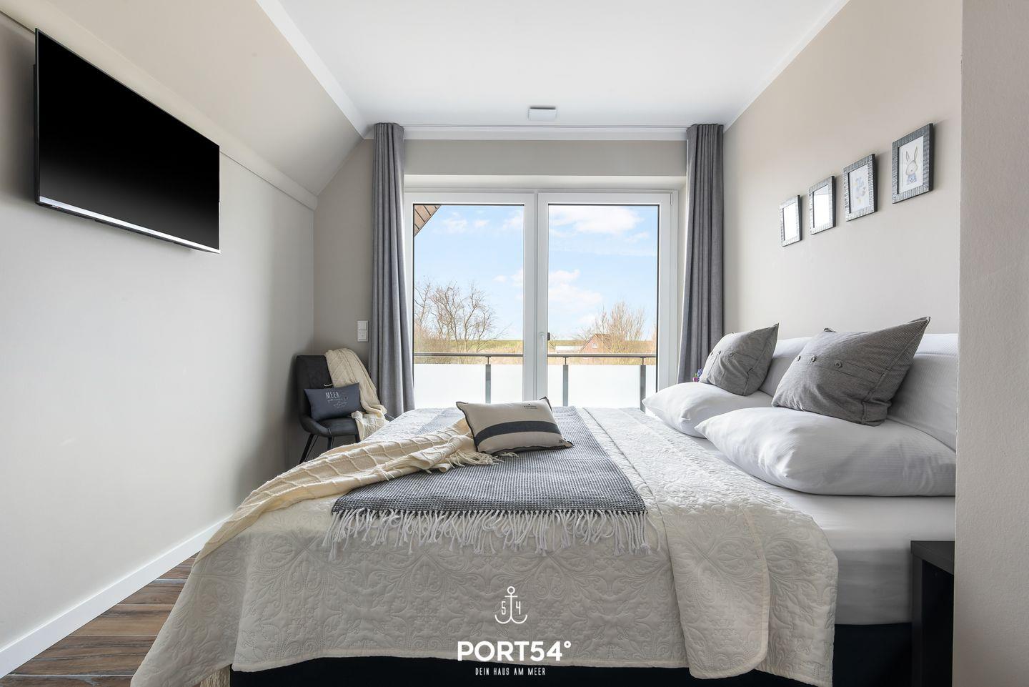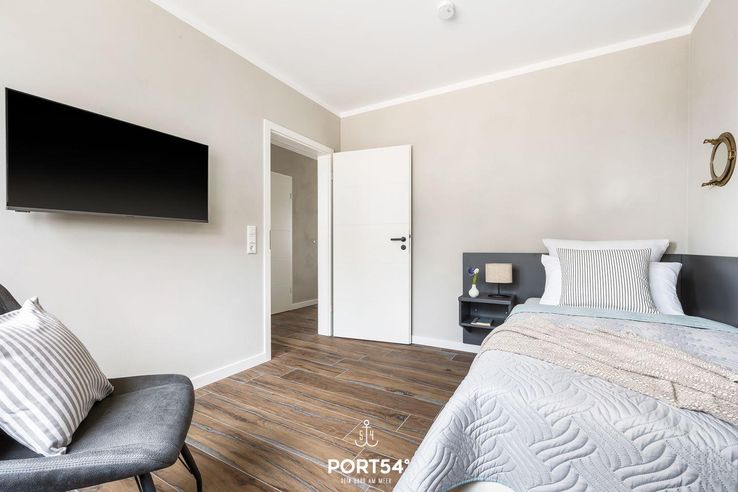 Das im Erdgeschoss gelegene Schlafzimmer verfügt über ein Einzelbett, welches sich in der Höhe verstellen lässt, sowie einen Flachbild-TV. Die im Obergeschoss gelegenen Schlafzimmer bieten zwei große Doppelbetten (je 180x200cm), eines davon verfügt ebenfalls über einen Flachbild-TV. Alle drei Schlafzimmer sind mit Verdunklungsvorhängen ausgestattet, sodass der Nachtruhe nichts im Wege steht.
