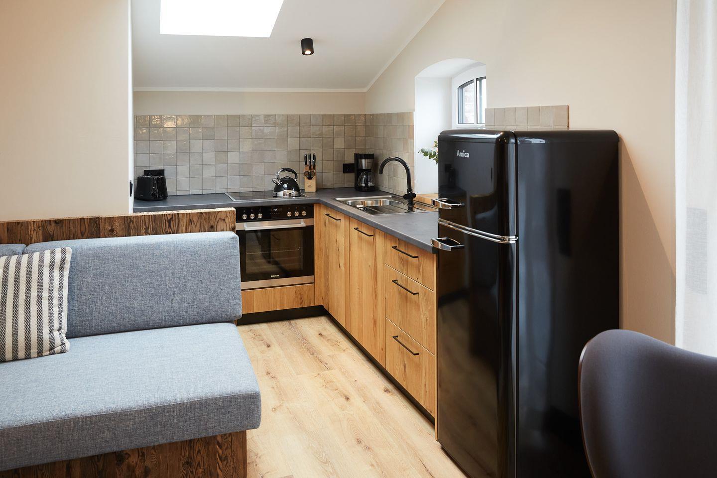Auf rund 76 Quadratmetern finden vier Gäste Ihr kleines Urlaubsrefugium mit einer modernen und hochwertigen Ausstattung. Genießen Sie das entspannte Ambiente im lässigen Industrial Style, das gleichzeitig jede Menge Cozyness versprüht. Zusätzlich sorgen schallisolierte 3-fach verglaste Fenster und eine Fußbodenheizung für maximale Behaglichkeit.