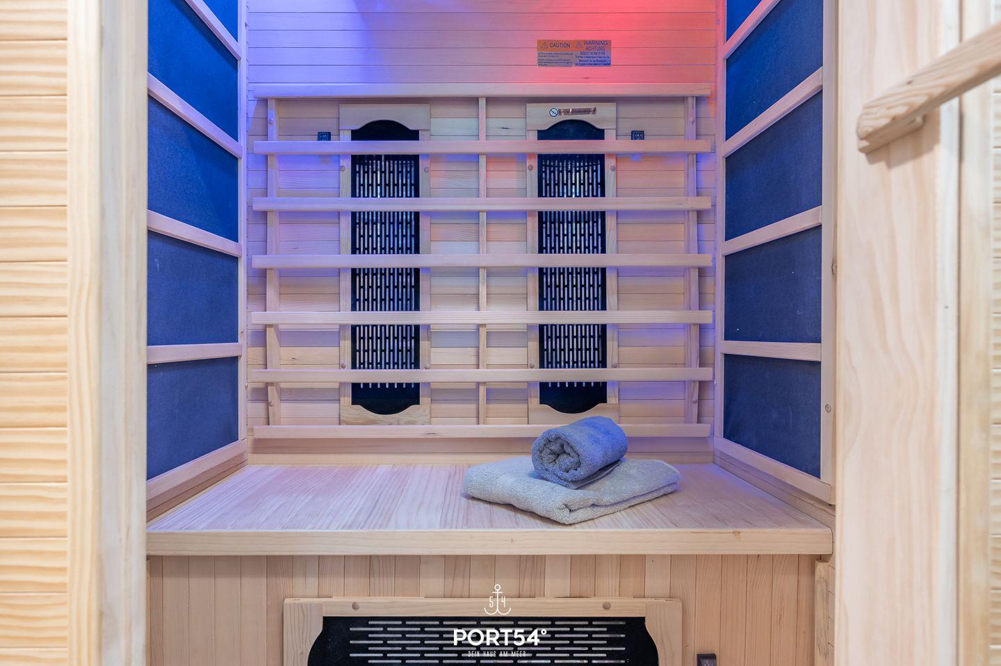 Das Badezimmer bietet neben einer Dusche und einem Haartrockner ein weiteres Highlight – eine Infrarotsauna. Auch hier gibt es ein Fliegengitter. Hier können Sie Ihre Seele baumeln lassen und sich nach langen Strandspaziergängen entspannen.