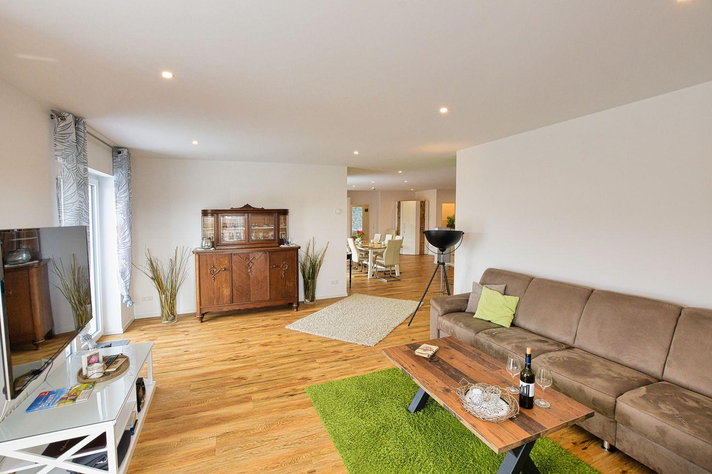 Im Essbereich können Sie mit der ganzen Familie entspannte Stunden verbringen. Der Wohnbereich lädt ebenfalls zum gemütlichen Verweilen ein.