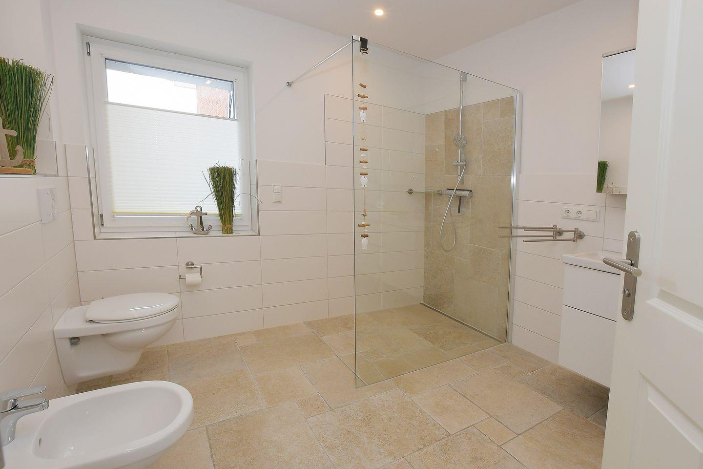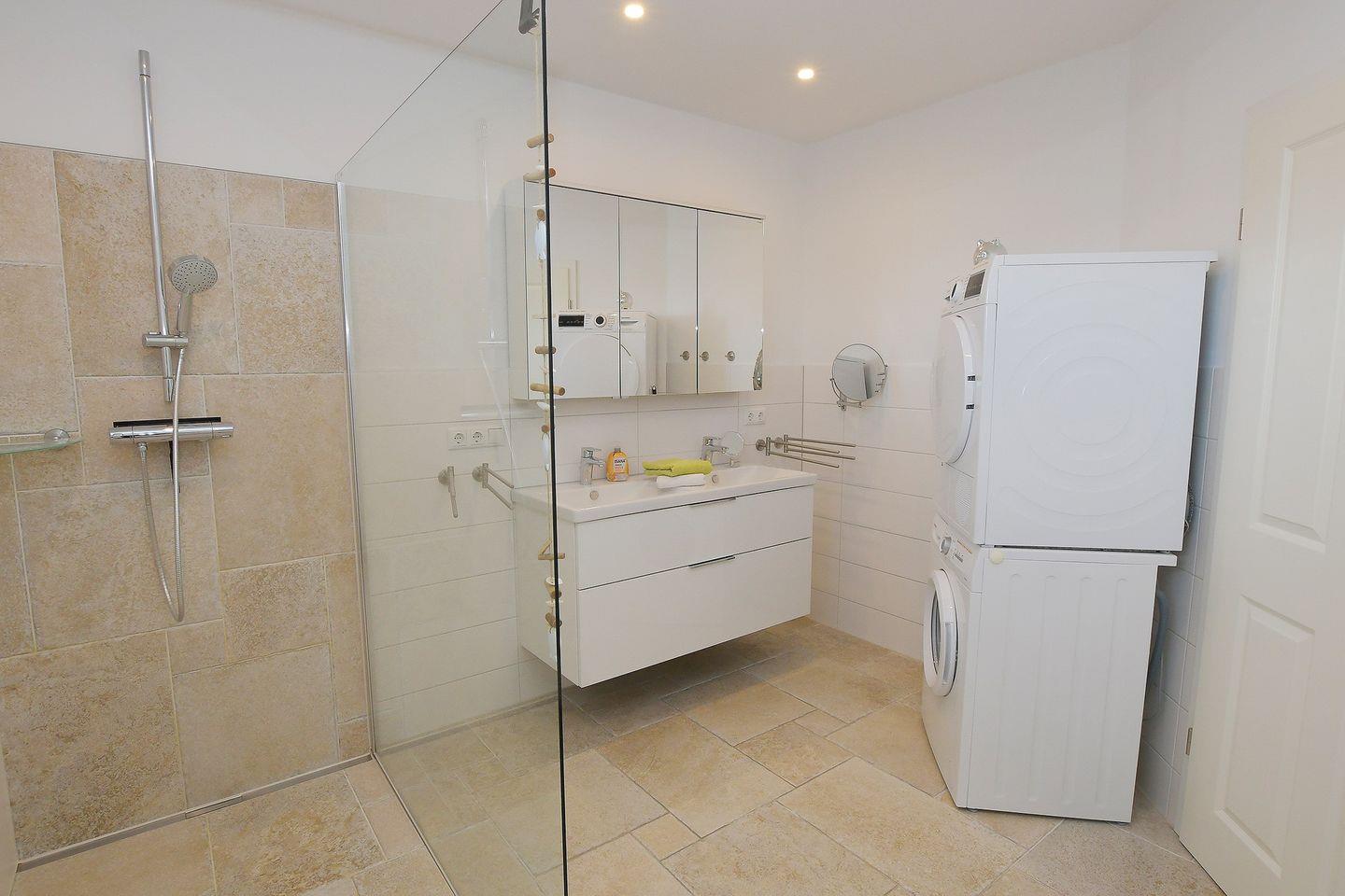 Das großzügig, modern gestaltete Badezimmer verfügt über eine ebenerdige Dusche. Ebenfalls befindet sich dort die Möglichkeit der eigenen Waschmaschinen- und Trocknernutzung.
