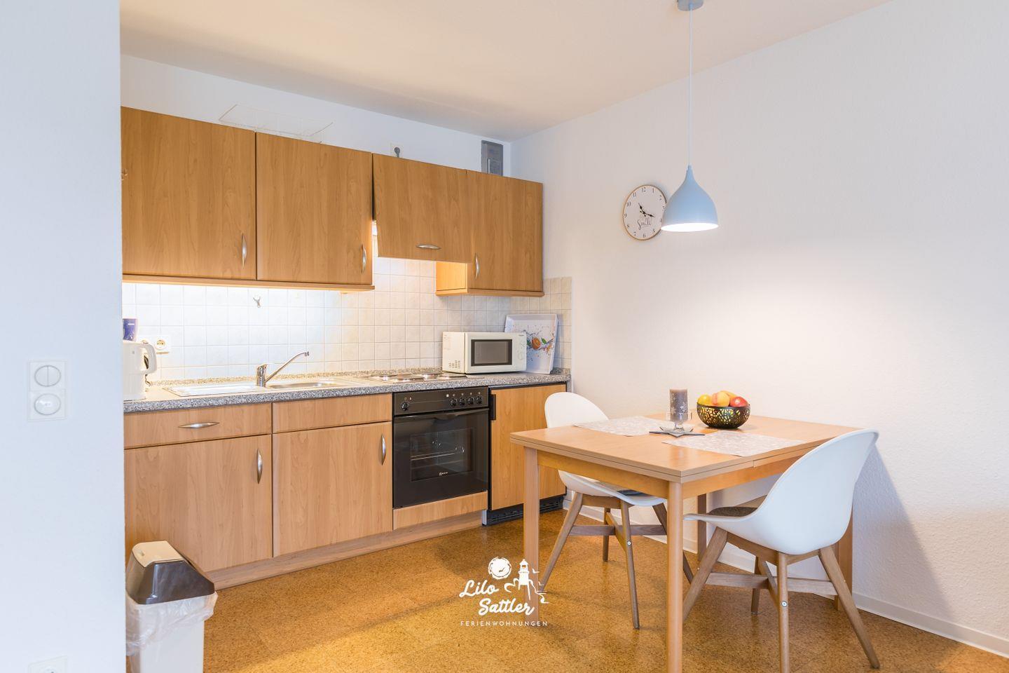 offene Küchenzeile, 4-Platten-Herd, Backofen, Abzugshaube, Mikrowelle, Kühlschrank mit Gefrierfach, Kaffeemaschine, Wasserkocher, Toaster, Eierkocher, Mikrowelle