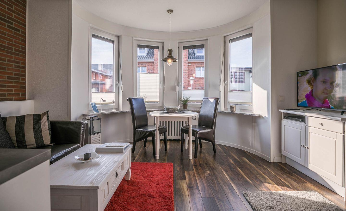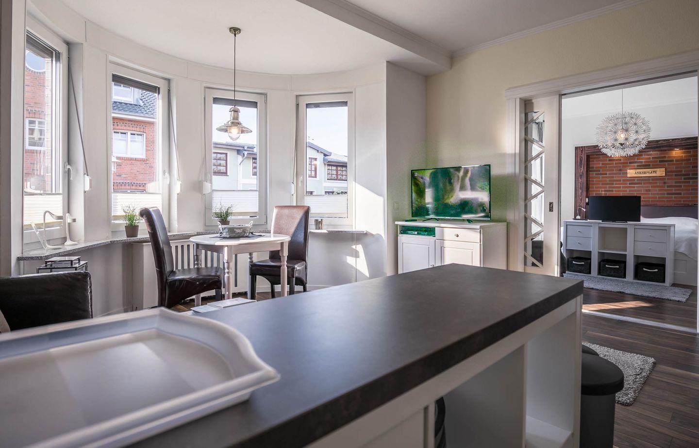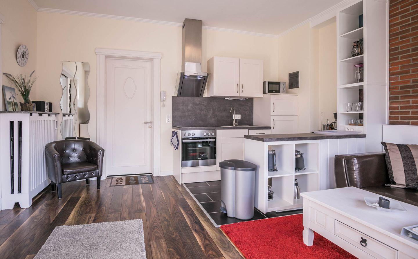 Aufgeteilt ist das Apartment in einen Wohn- und Essbereich mit offener Küche. Die Küche ist mit einem Herd, Backofen, einer Mikrowelle und einer Geschirrspülmaschine ausgestattet. Das Highlight des Wohnbereiches ist der sonnige Erker. Von dem Wohnbereich gelangen Sie in das durch eine Schiebetür abgetrennte Schlafzimmer. Im gemütlichen Schlafzimmer befindet sich ein Doppelbett und ein Kleiderschrank. Das Tageslichtbad verfügt über eine flache Duschwanne (Regendusche) und einen Handtuchheizkörper.