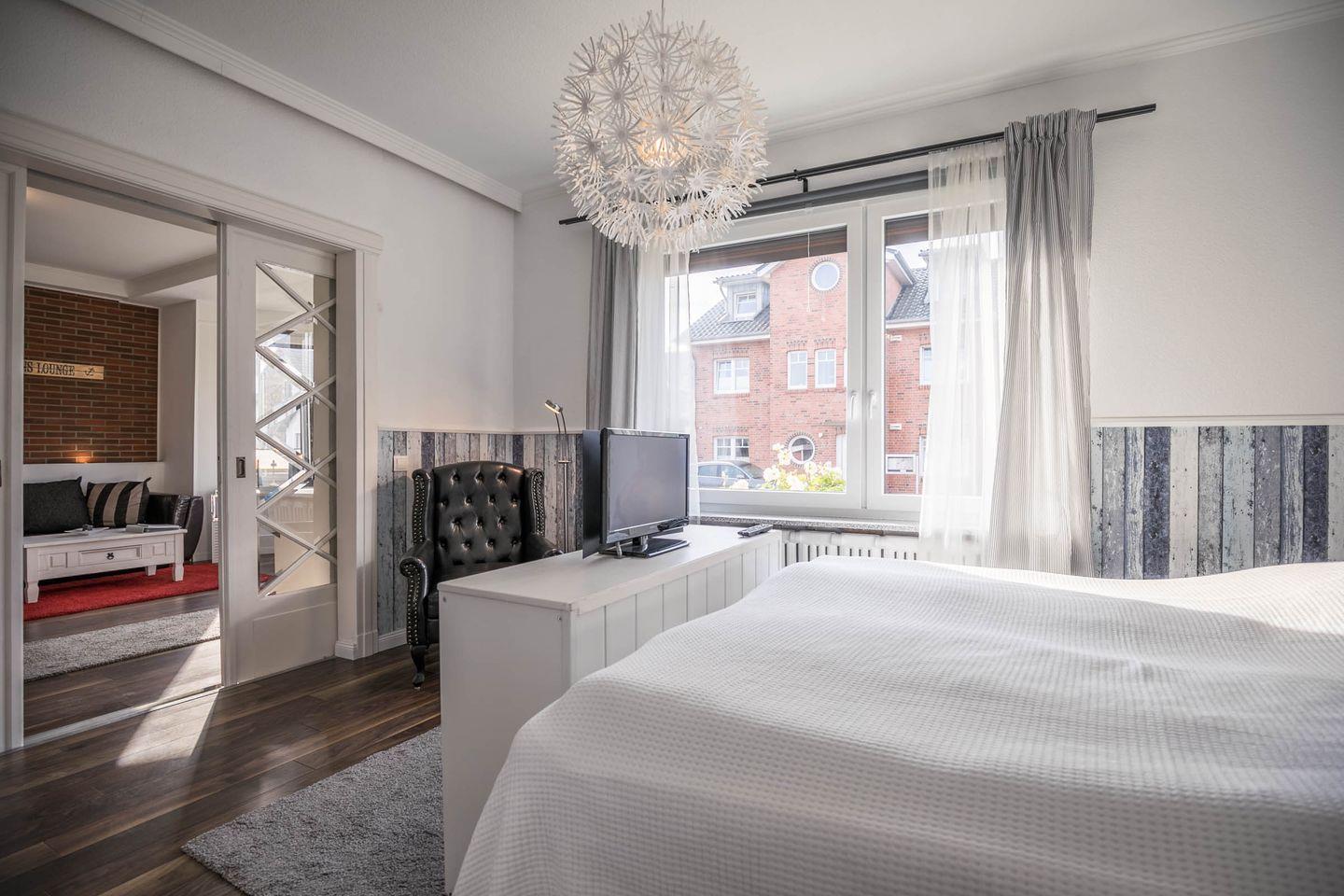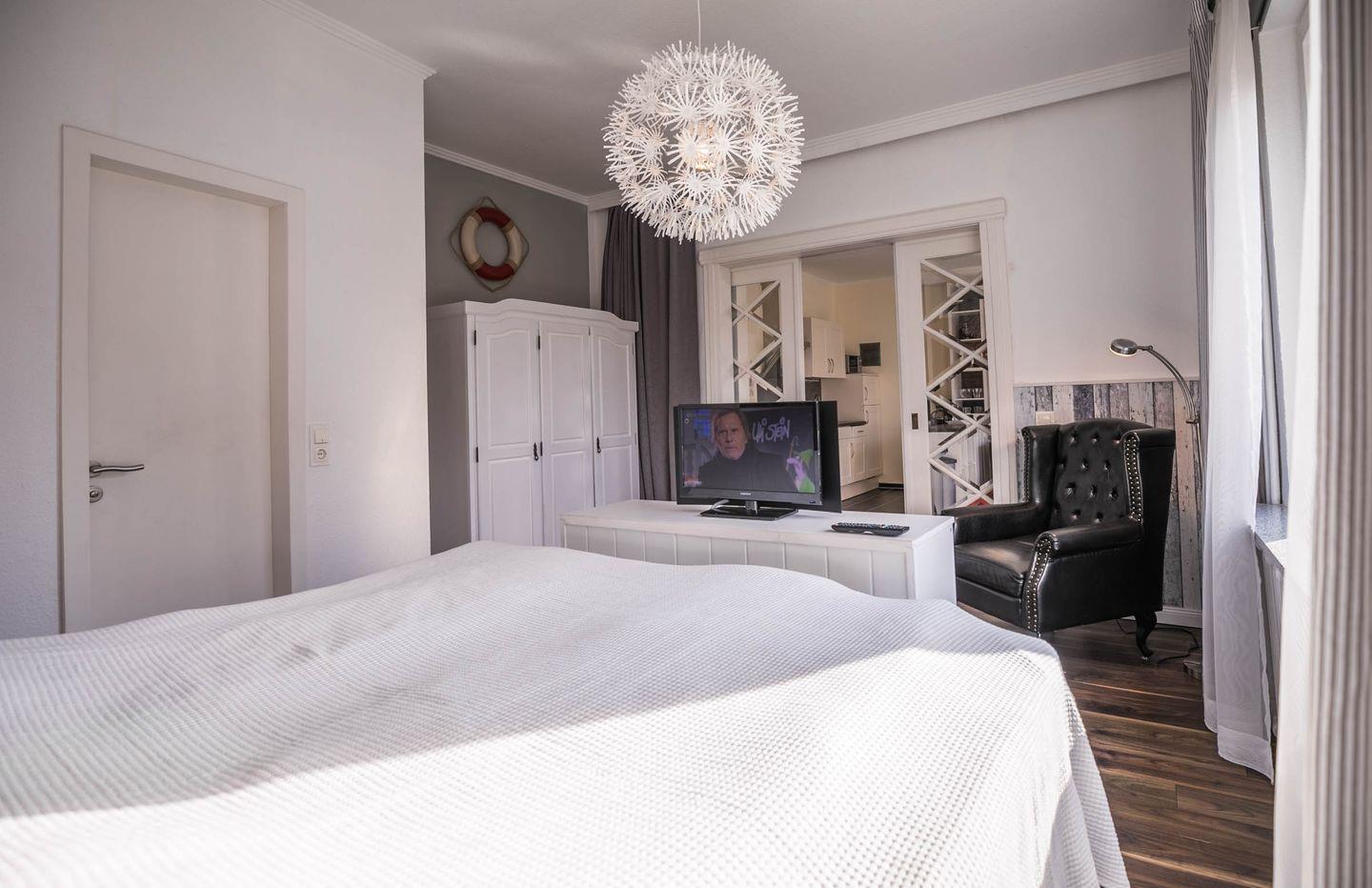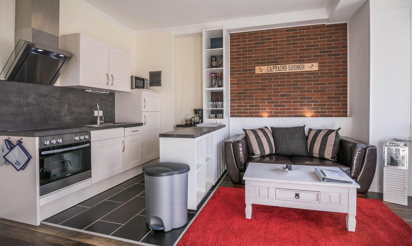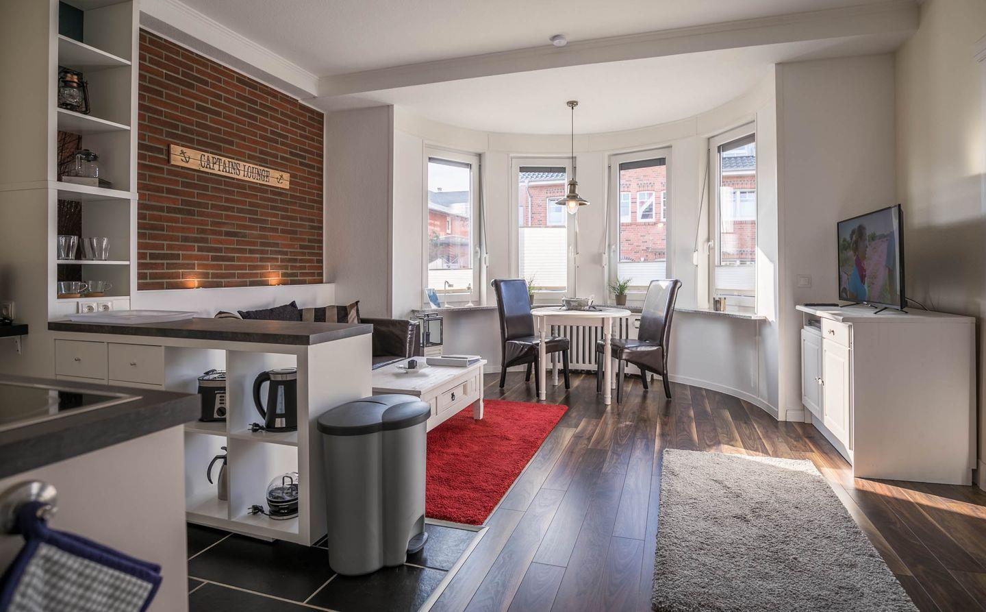Aufgeteilt ist das Apartment in einen Wohn- und Essbereich mit offener Küche. Die Küche ist mit einem Herd, Backofen, einer Mikrowelle und einer Geschirrspülmaschine ausgestattet. Das Highlight des Wohnbereiches ist der sonnige Erker. Von dem Wohnbereich gelangen Sie in das durch eine Schiebetür abgetrennte Schlafzimmer. Im gemütlichen Schlafzimmer befindet sich ein Doppelbett und ein Kleiderschrank. Das Tageslichtbad verfügt über eine flache Duschwanne (Regendusche) und einen Handtuchheizkörper.