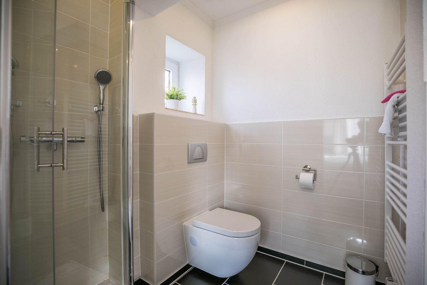 Sanitär: Tageslicht - Duschbad (Regendusche), Handtuchheizung, Haar-Föhn, Kosmetikspiegel