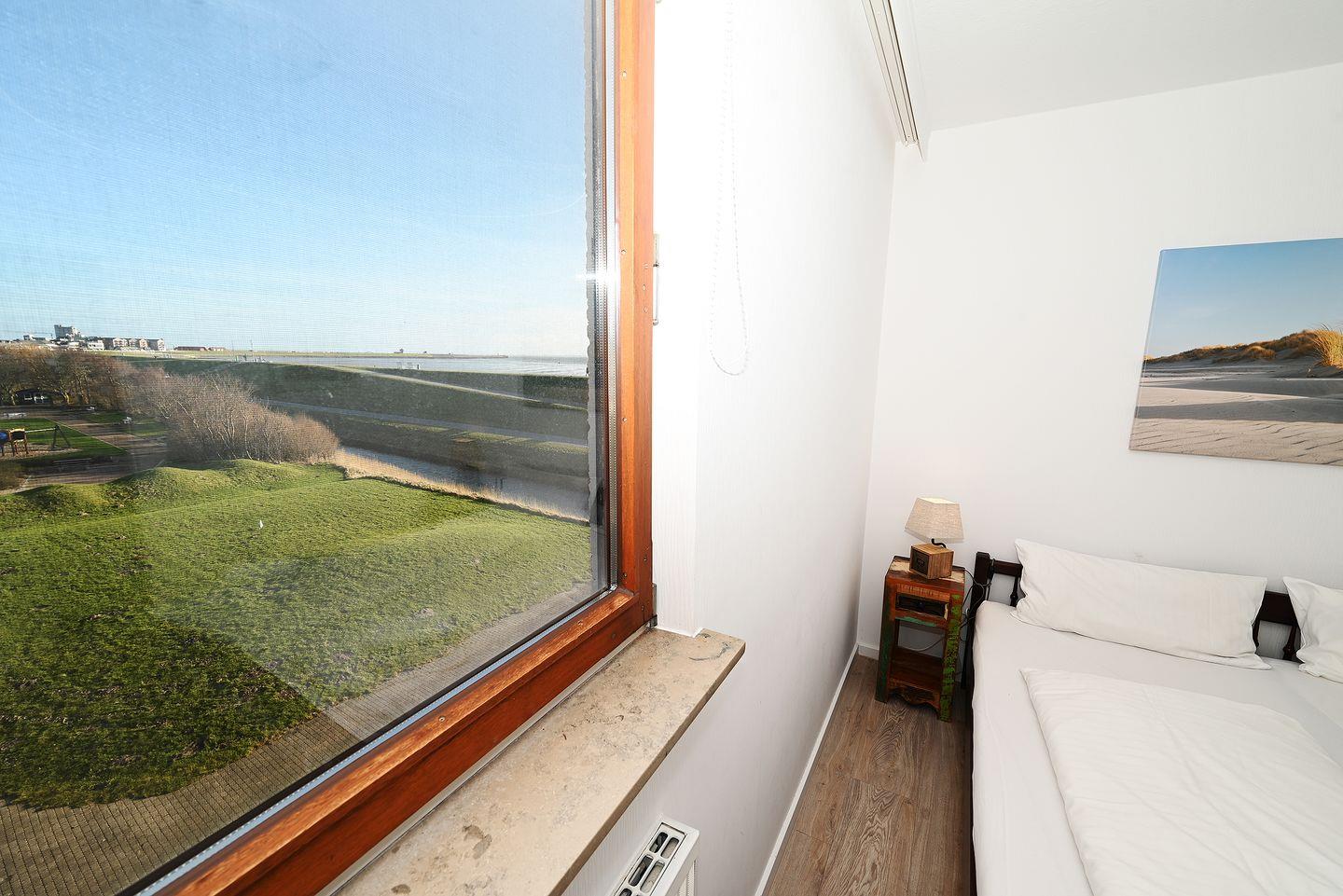 Zwei Personen schlafen im Schlafzimmer mit Doppelbett, zwei auf dem gemütlichen Schlafsofa im Wohnzimmer. Von beiden Zimmern aus können Sie den Blick auf die Nordsee genießen.