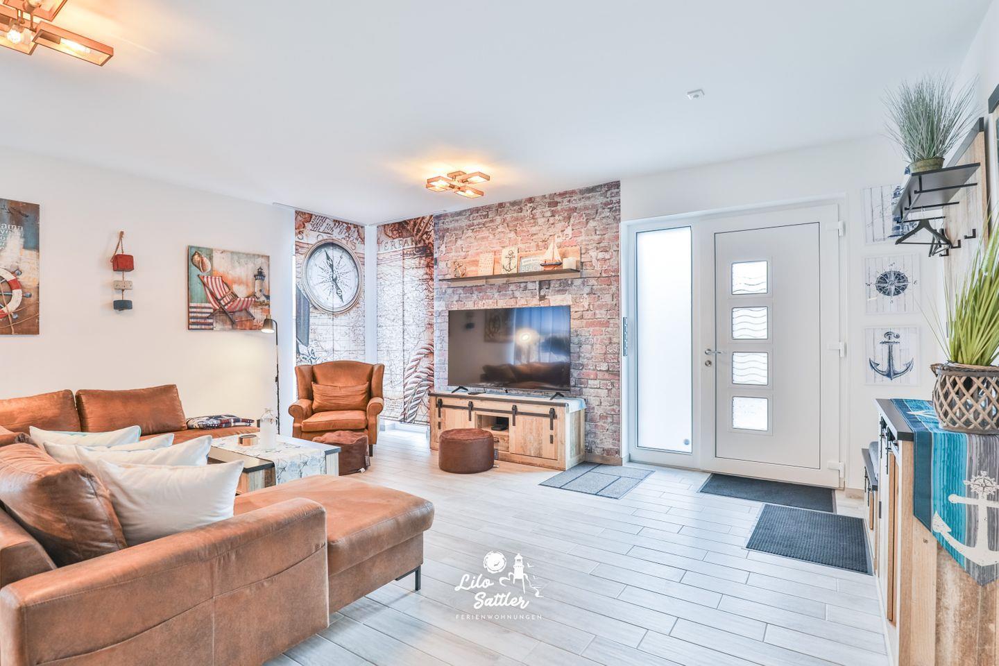 großes gemütliches Sofa, Sessel, Flachbild-Smart-TV, Esstisch mit 6 Stühlen, Digitalradio, Schiebegardinen, Zugang zur Terrasse und zum Garten