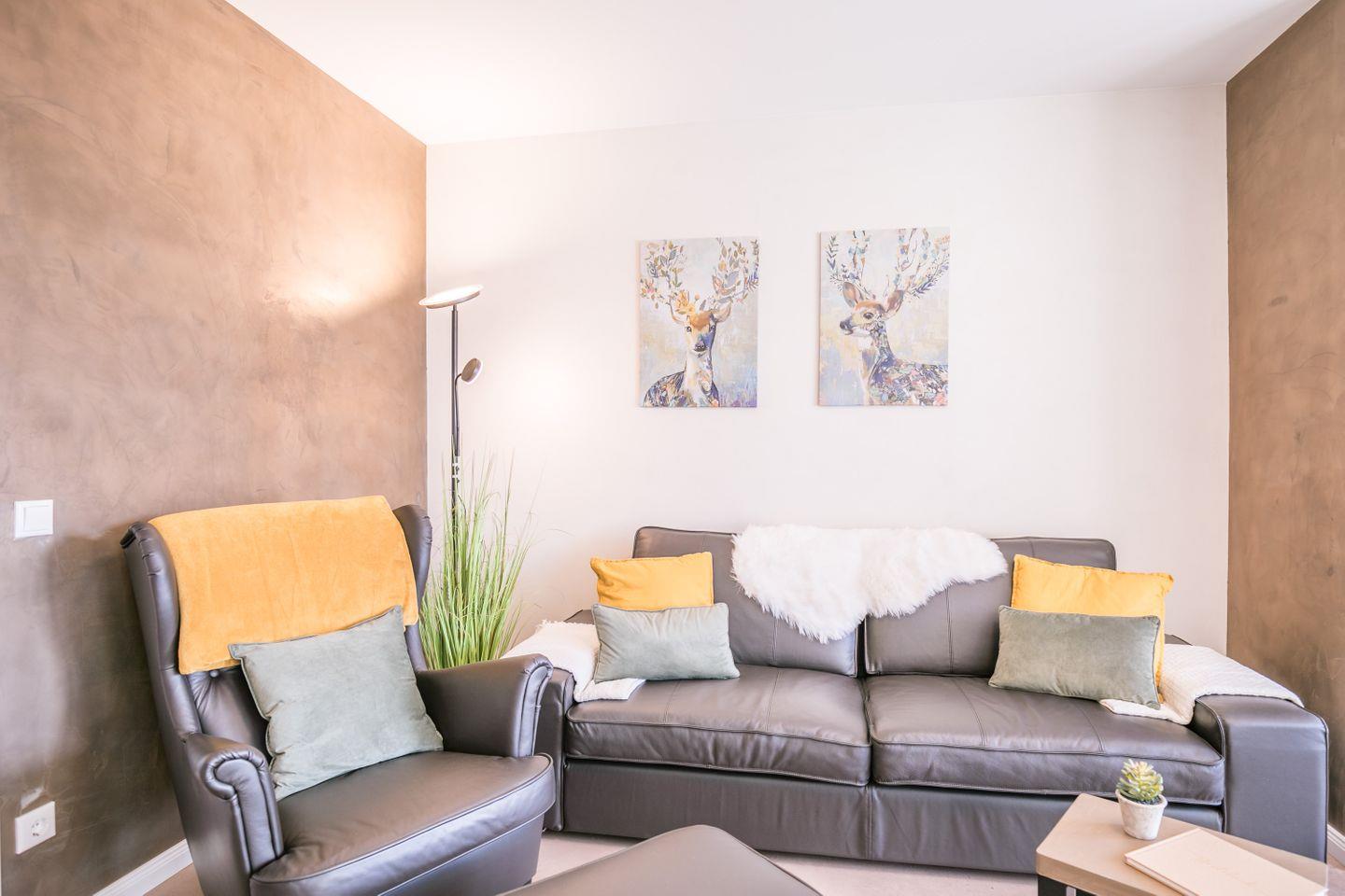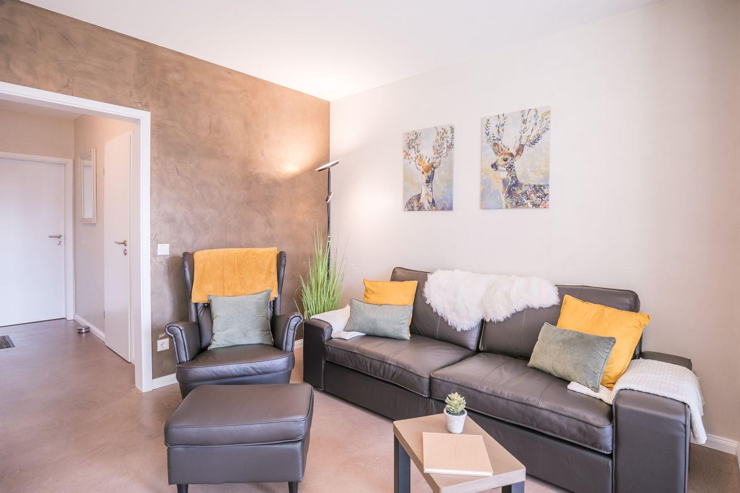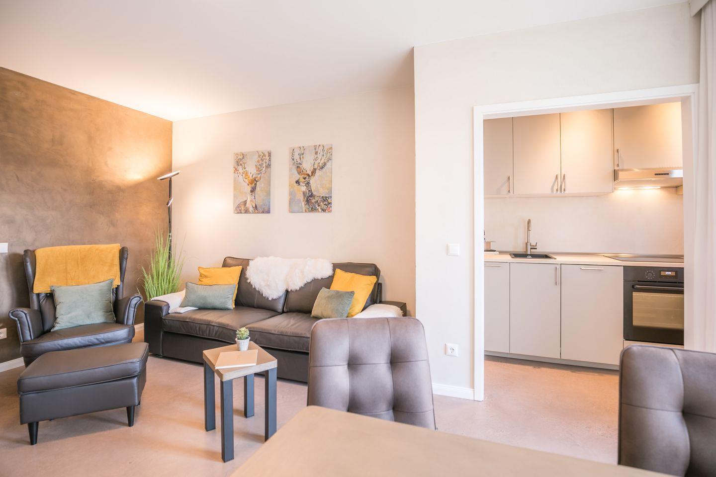 Das Wohnzimmer ist mit einer bequemen Ledercouch und einem Sessel + Hocker möbliert, ergänzt wird der Raum mit einem TV-Board samt Smart-TV und einem Esstisch mit 4 gemütlichen Stühlen, dieser steht am großen Fenster mit Blick auf den Süd-Balkon.