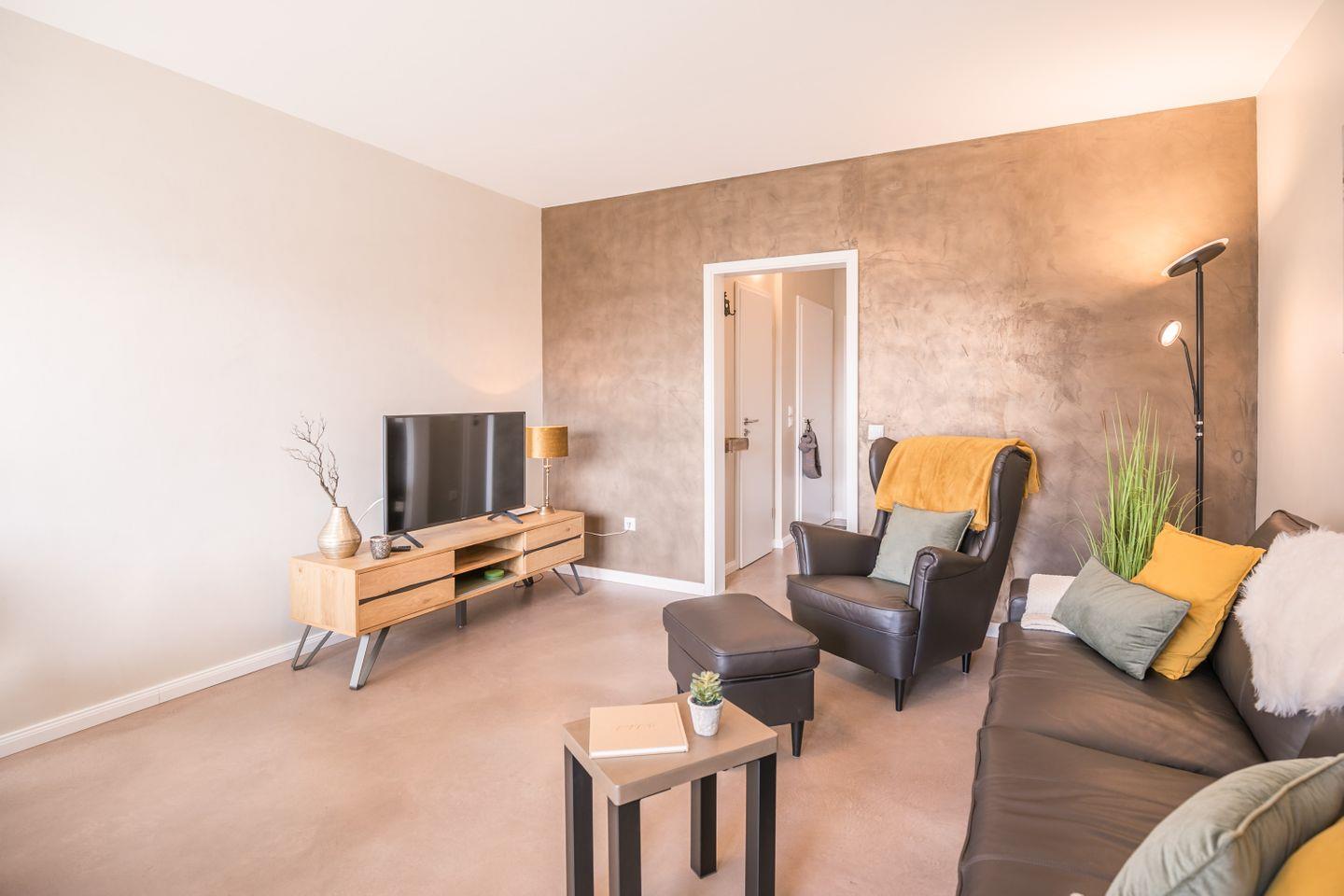 Beim Betreten der Wohnung fällt sofort der polierte Boden ins Auge, genauso wie die gespachtelten und polierten Wände, beides in Naturtönen. Diese schaffen eine besondere Atmosphäre, denn es zieht sich durch die ganze Wohnung.