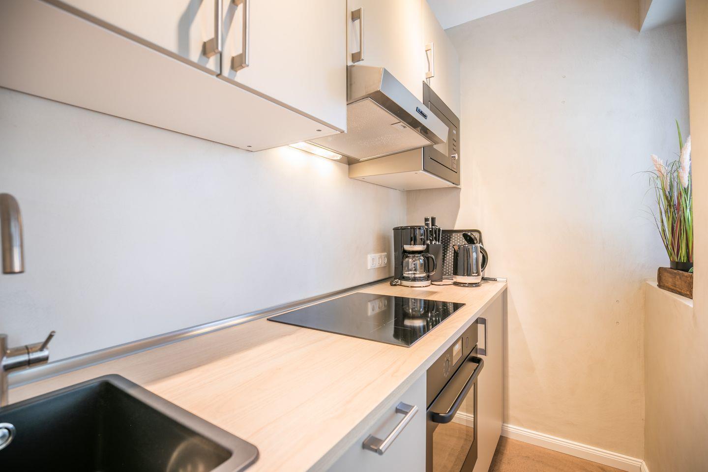 offen zum Wohnraum, moderne Küchenzeile mit Geschirrspüler, Kühlschrank mit Gefrierfach, Ceranfeld, Abzugshaube, Backofen und Mikrowelle, Kaffeemaschine, Wasserkocher, Toaster