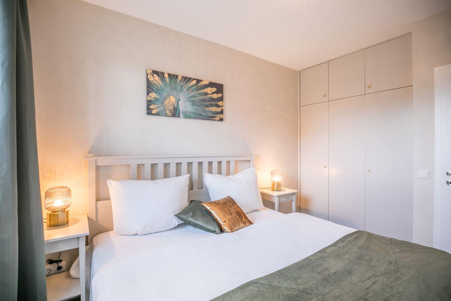 Das Schlafzimmer ist möbliert mit einem Bett, Nachttischen, Einbauschrank und einer geschmackvollen Beleuchtung.