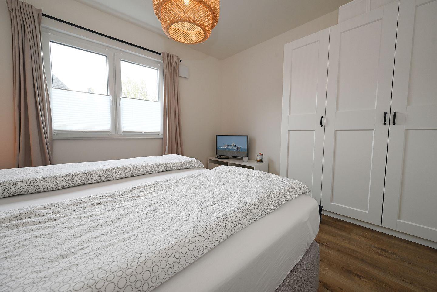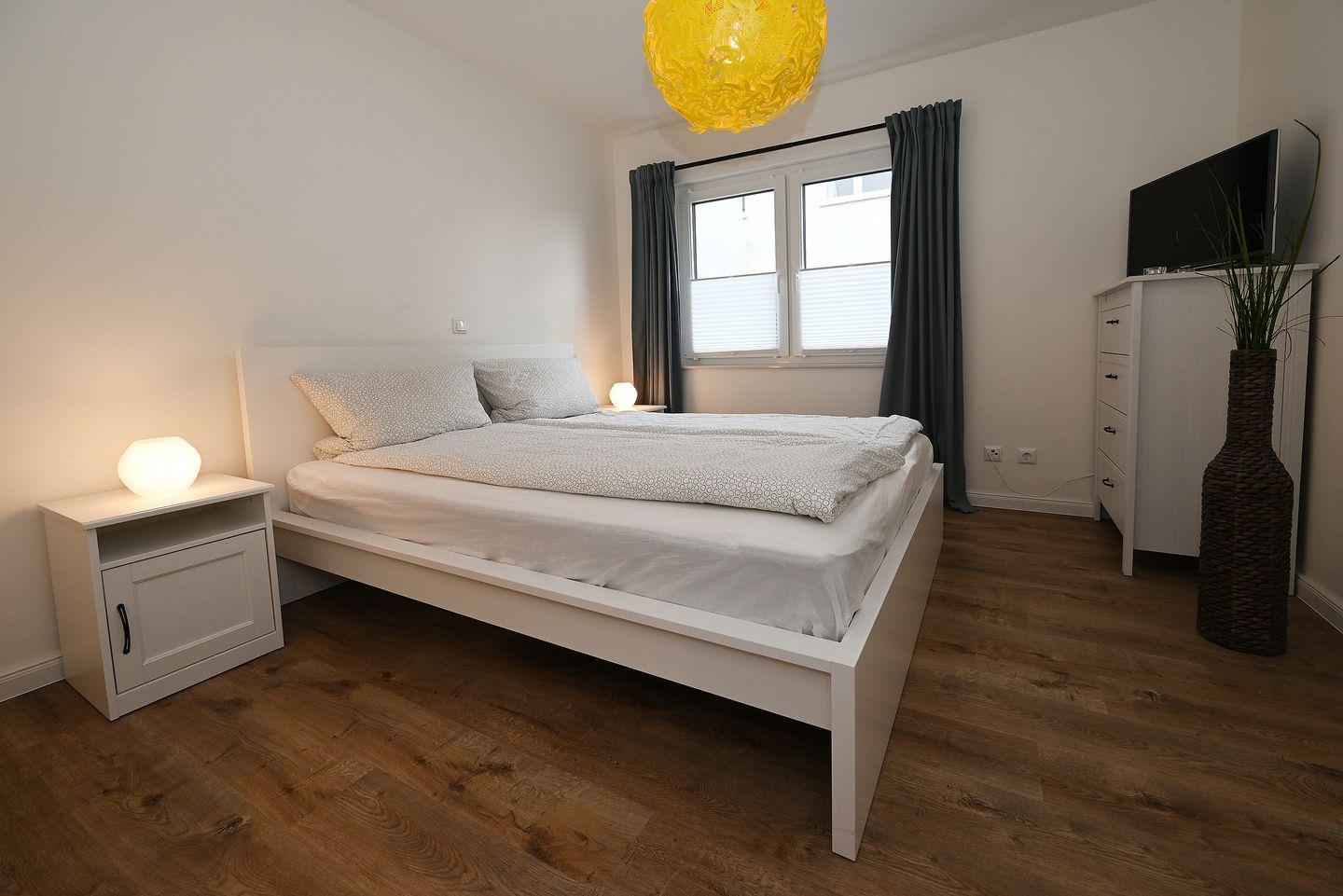 Aufgeteilt ist sie in zwei moderne Schlafzimmer mit je einem Doppelbett , Fernseher und Außenjalousien!