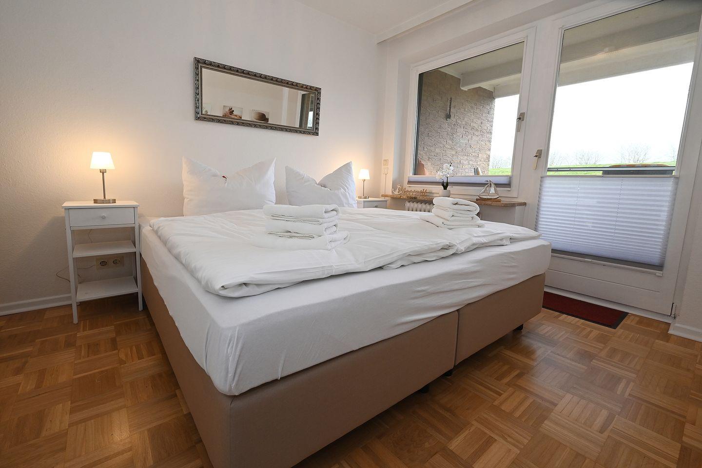 Das Schlafzimmer verfügt über ein Boxspringbett. In der ganzen Wohnung gibt es elektrische Außenjalousien.