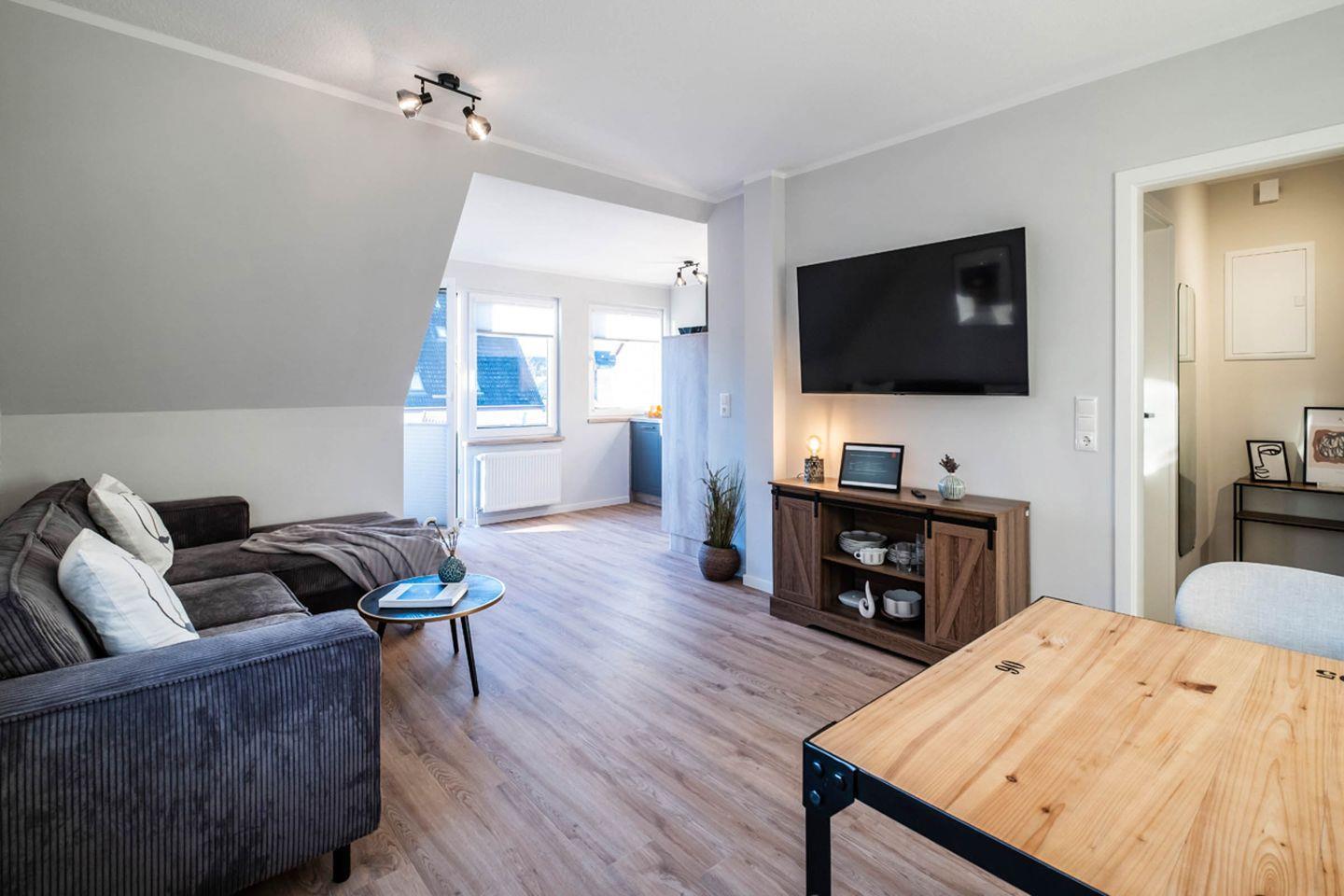 1 Wohnzimmer mit Essbereich, eine kleine Küchenzeile, 1 Schlafzimmer und 1 Duschbad