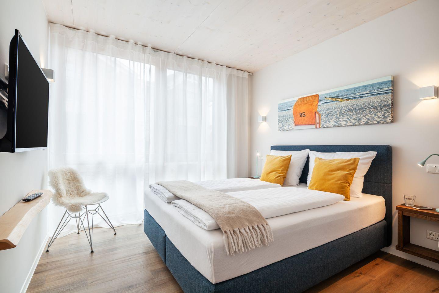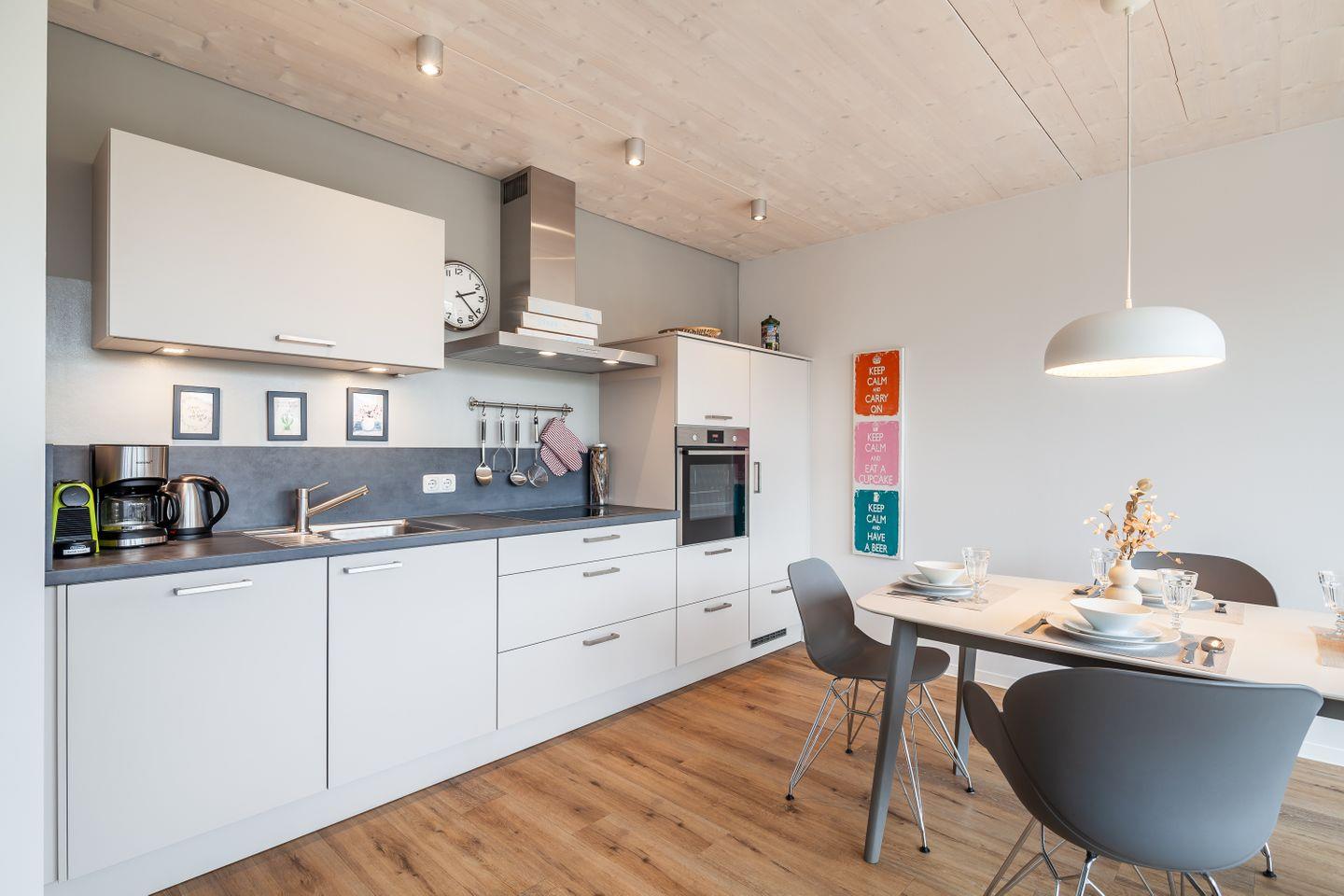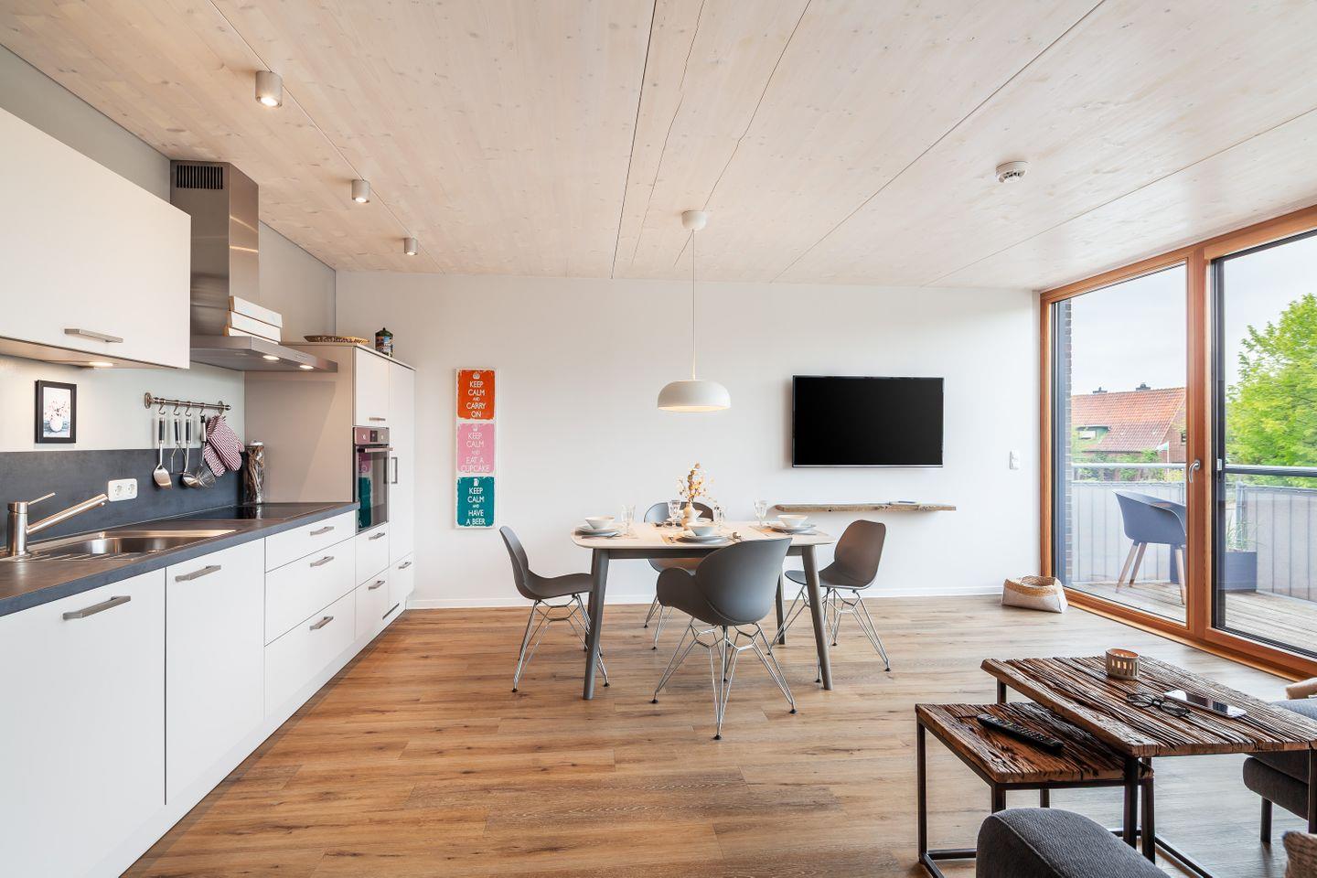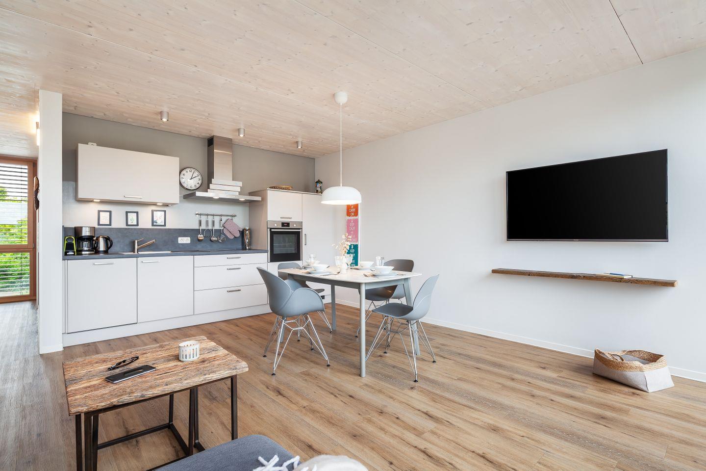 Zwei Schlafzimmer mit TV bieten ruhige Rückzugsorte, das Duschbad mit ebenerdiger Dusche und Fußbodenheizung sorgt für einen angenehmen Start in den Urlaubstag. Die Küchenzeile ist hochwertig ausgestattet – ideal für das schnelle Frühstück ebenso wie für den gemütlichen Kochabend nach Strand und Hafenbummel.