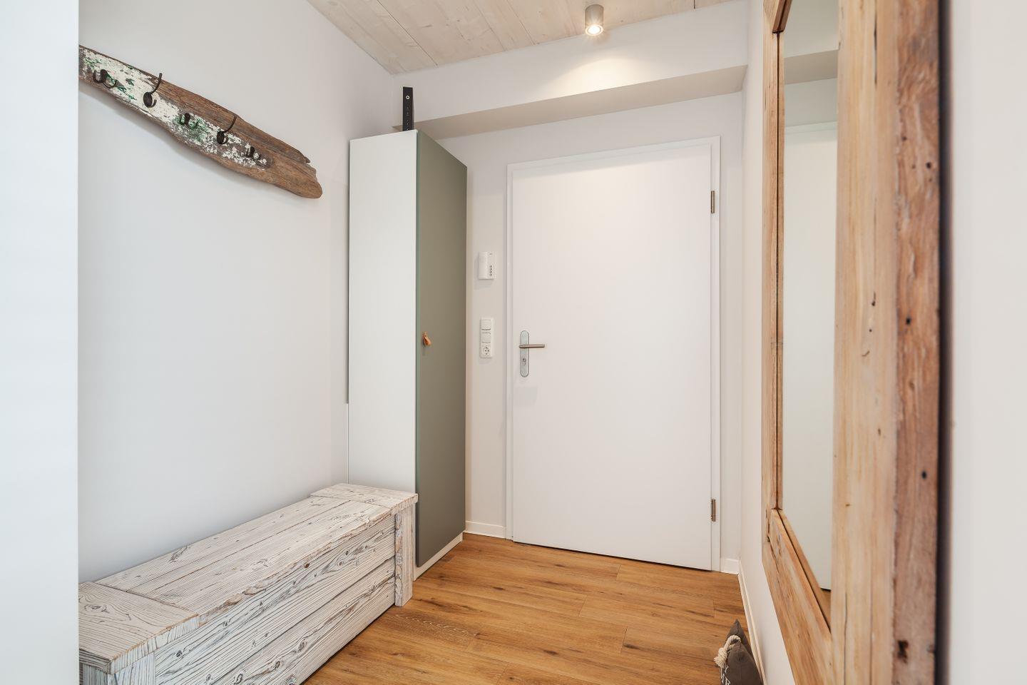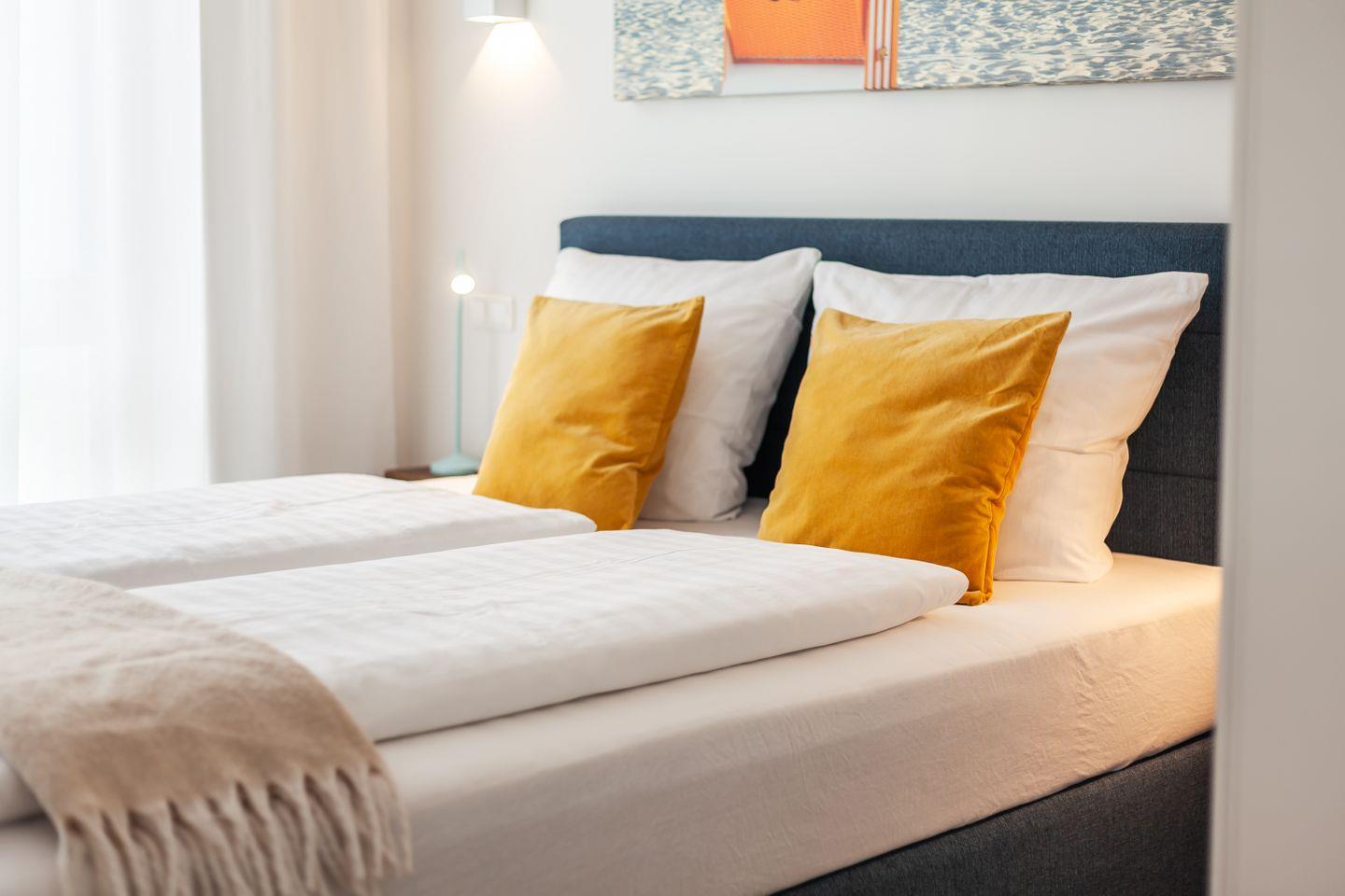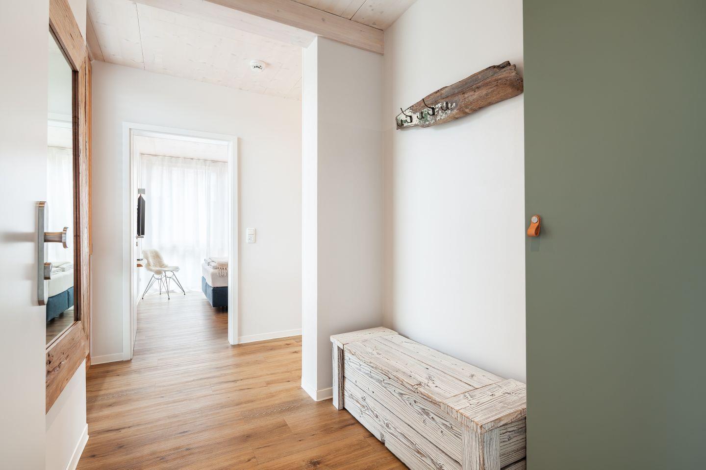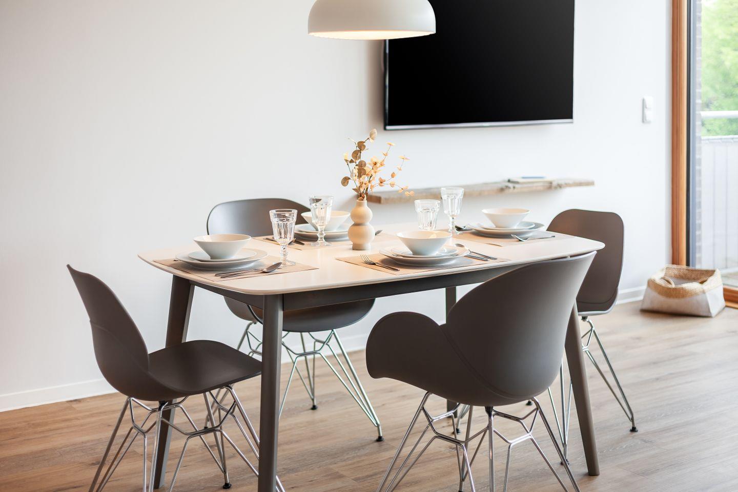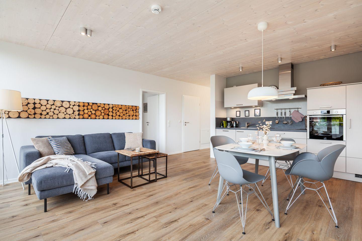 Zwei Schlafzimmer mit TV bieten ruhige Rückzugsorte, das Duschbad mit ebenerdiger Dusche und Fußbodenheizung sorgt für einen angenehmen Start in den Urlaubstag. Die Küchenzeile ist hochwertig ausgestattet – ideal für das schnelle Frühstück ebenso wie für den gemütlichen Kochabend nach Strand und Hafenbummel.