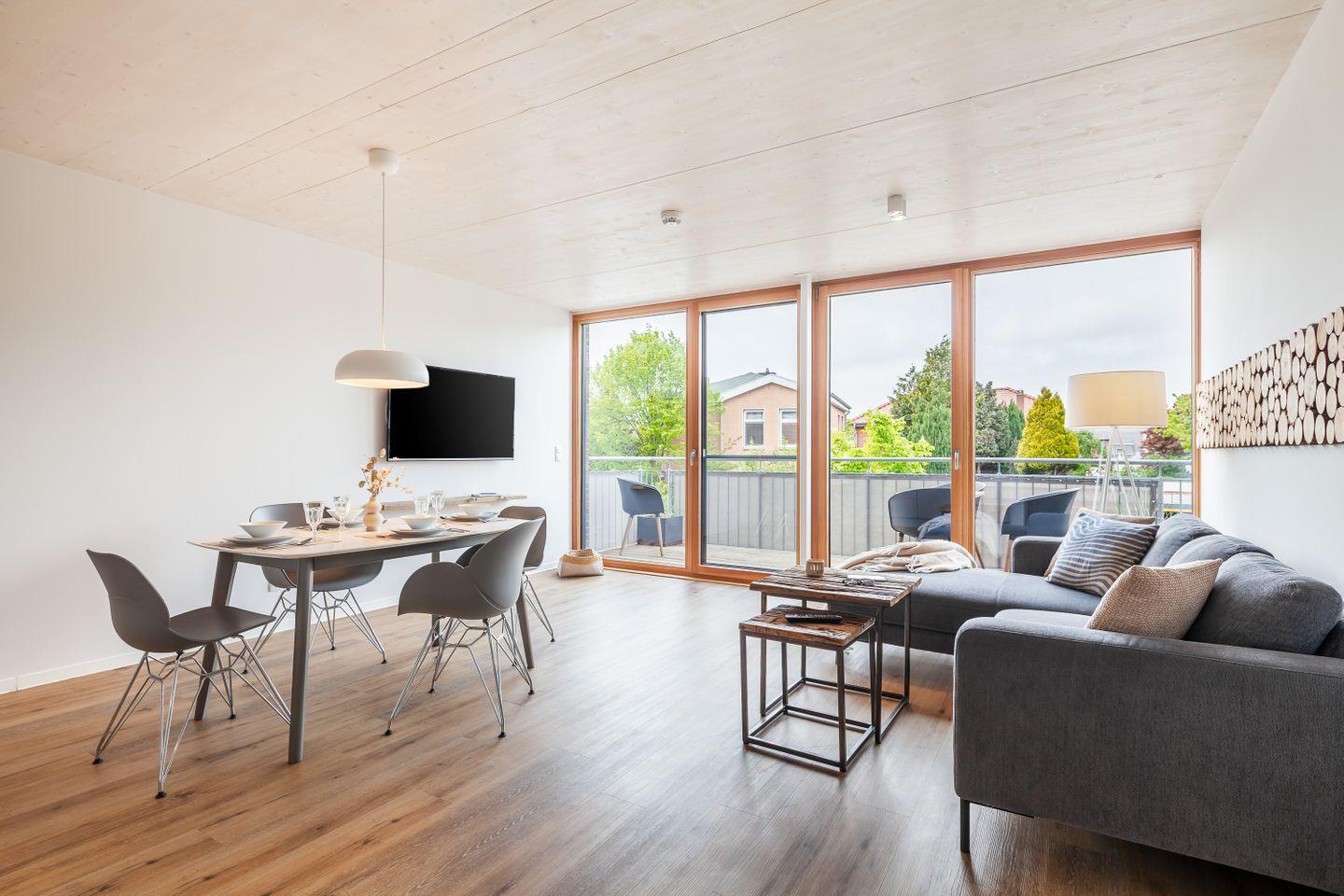 Im Architektenhaus Best Büsum wohnen Sie in der Wohnung Ebbe komfortabel und mit viel Platz – nah am Binnen-Deich, zentral und nur wenige Minuten zu Hafen, Bahnhof, Einkauf und Stadtzentrum. Der helle Wohn-/Essbereich öffnet sich zum Balkon; hier beginnt der Tag mit Nordseeluft und endet beim entspannten Sundowner mit Blick ins Grüne.