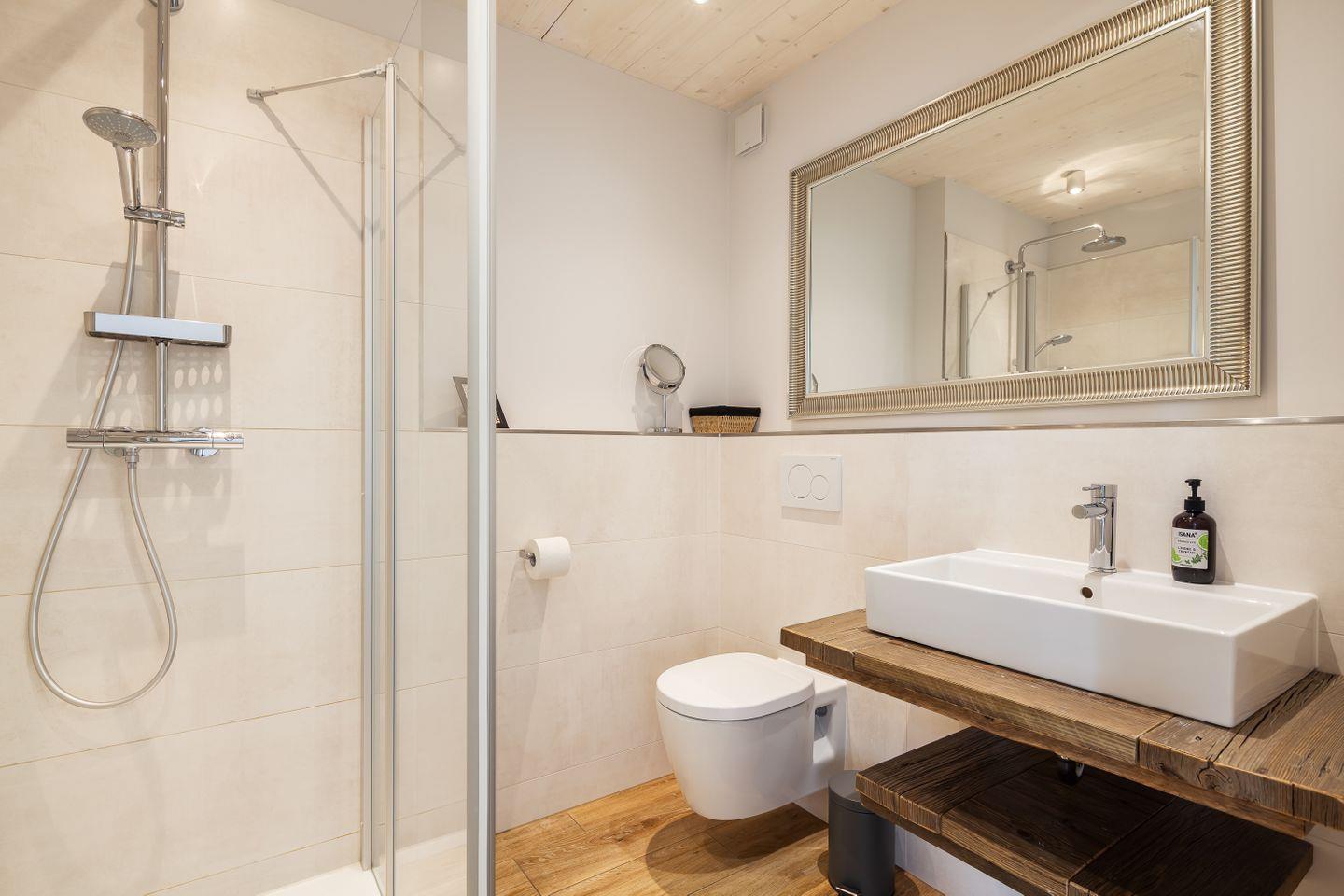 Duschkabine mit ebenerdiger Dusche, Spiegel, WC, Waschbecken, Handtuchtrockner, Fön, Fußbodenheizung