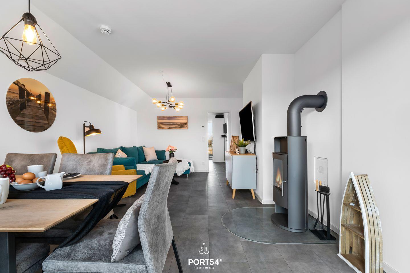 Die Ferienwohnung "Fischers Koje" bietet auf ca. 80m² Platz für bis zu 5 Personen. Neben einem offenen Wohn- und Essbereich mit angrenzender, moderner und hochwertig ausgestatteter Küche, verfügt die Wohnung über zwei Schlafzimmer, ein Badezimmer und einen großen Balkon. Im gemütlichen Wohnbereich lädt ein Kamin dazu ein, es sich an kalten Tagen gemütlich zu machen. Eines der beiden Schlafzimmer verfügt über ein Doppel-Boxspringbett (180x200cm) und einen TV, das andere bietet zwei Einzelboxspringbetten (je 90x200cm) und ebenfalls einen TV. Das geräumige Badezimmer verfügt über eine ebenerdige Dusche. Nach einem Spaziergang im Winter können Sie sich in der Infrarot-Sauna wieder aufwärmen. Alle Zimmer verfügen über Verdunkelungsmöglichkeiten und Insektenschutz. Genießen Sie den Abend auf dem mit Gartentisch & Stühlen, sowie Elektrogrill ausgestattetem Balkon.