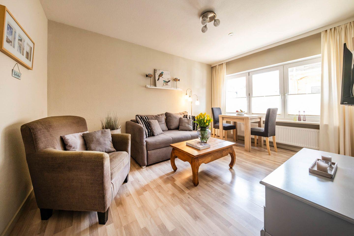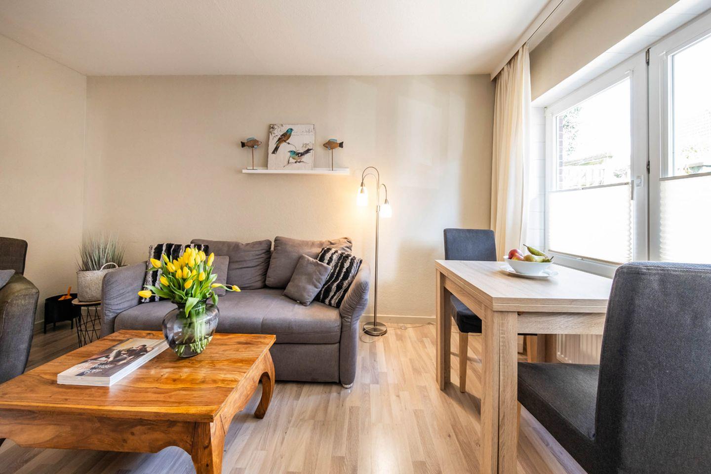 Op de Westerwarft Wohnung 2 in Büsum bietet auf 41 m² eine gemütliche Unterkunft im Parterre mit Terrasse und Gartenmöbeln. Die Nichtraucherwohnung verfügt über ein Schlafzimmer, ein modernes Bad mit Dusche und Wanne, eine offene Küche, kostenfreies WLAN und Privatparkplatz. Kinder und ein Haustier (maximal eines) sind willkommen. Einkaufsmöglichkeiten, Strand und Restaurants befinden sich in nur 250 m Entfernung.