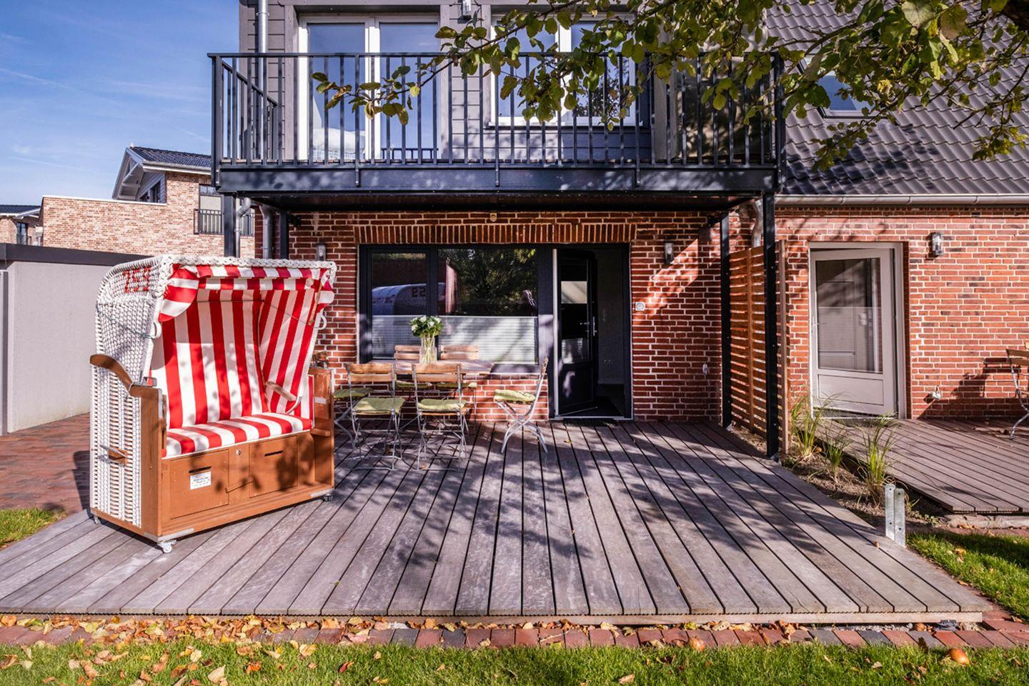 Ein Highlight der Ferienwohnung ist die Südwest-Terrasse, von der aus Sie frische Luft schnappen und die Ruhe der Umgebung genießen können. Auf dieser befindet sich ihr persönlicher Strandkorb sowie Tisch und Stühle. Dies macht die Unterkunft zu einem perfekten Ort für sie.