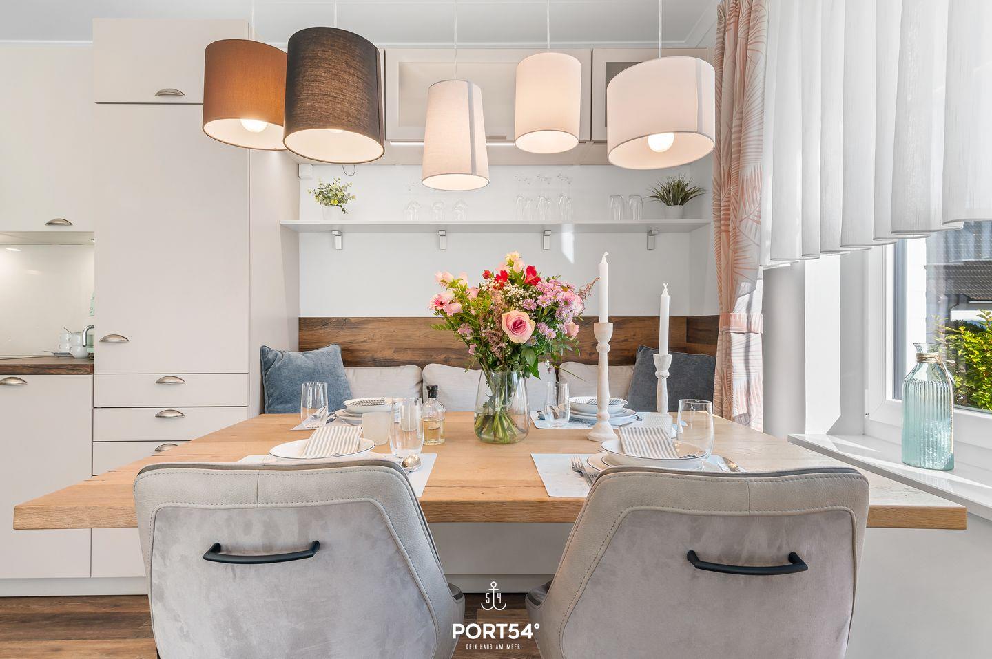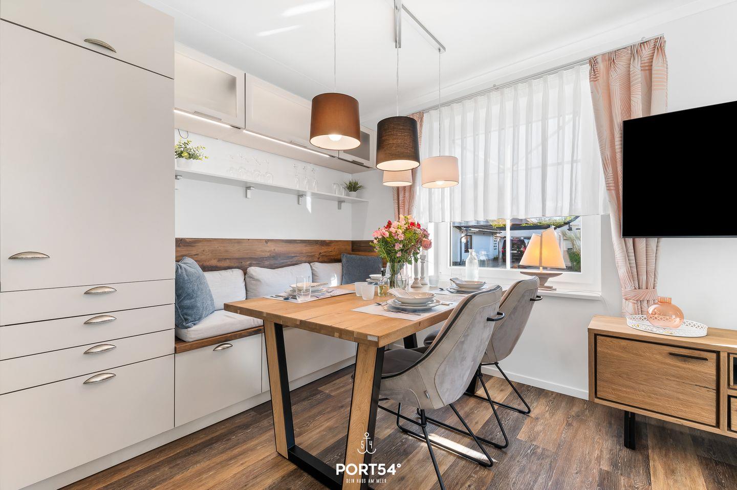 Die Ferienwohnung verfügt über zwei liebevoll eingerichtete Schlafzimmer mit Fliegenschutz, eines mit einem komfortablen Doppelbett und das andere mit zwei Einzelbetten. Das helle, moderne Wohnzimmer mit bequemer Couch, Flachbild-TV und kostenlosem WLAN lädt zum Entspannen und Verweilen ein. Die offene, voll ausgestattete Küche mit Herd, Backofen, Kühlschrank, Geschirrspüler, Kaffeemaschine und Mikrowelle bietet alles, was Sie für die Zubereitung Ihrer Lieblingsgerichte benötigen. Direkt daneben befindet sich eine gemütliche Essecke, an der Sie gemeinsam speisen können.