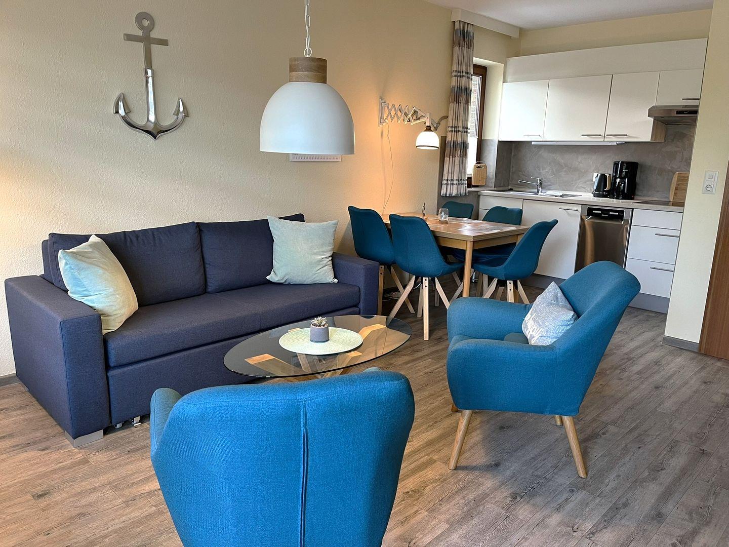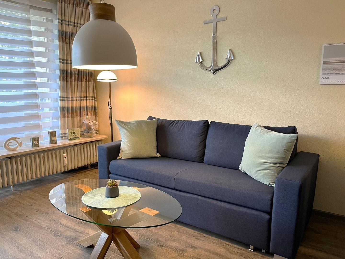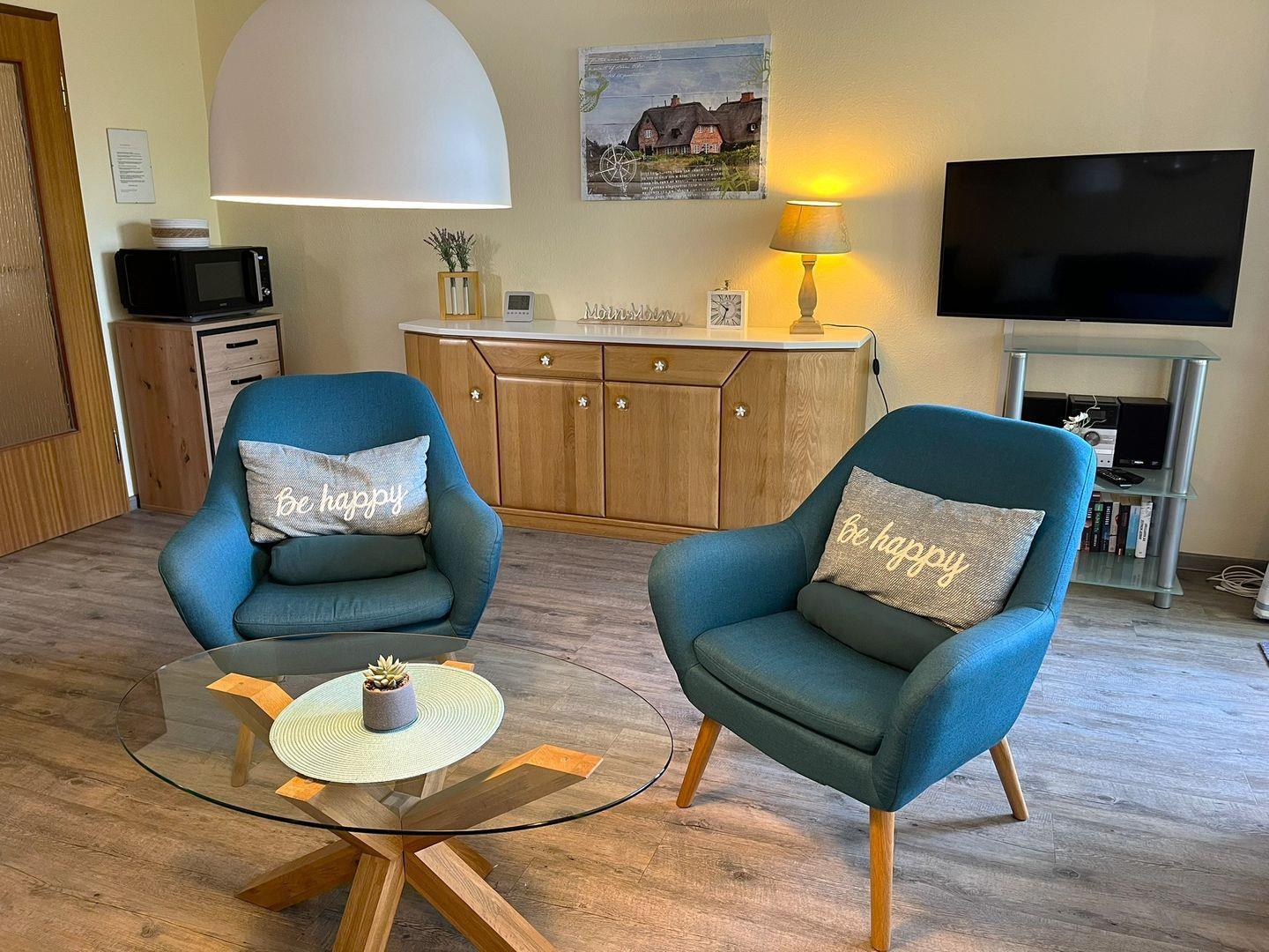 Der Wohnraum ist mit einem bequemen Sofa und 2 Sesseln eingerichtet, so dass man sich auch mal bei einem guten Buch oder einem Film die Zeit vertreiben kann.