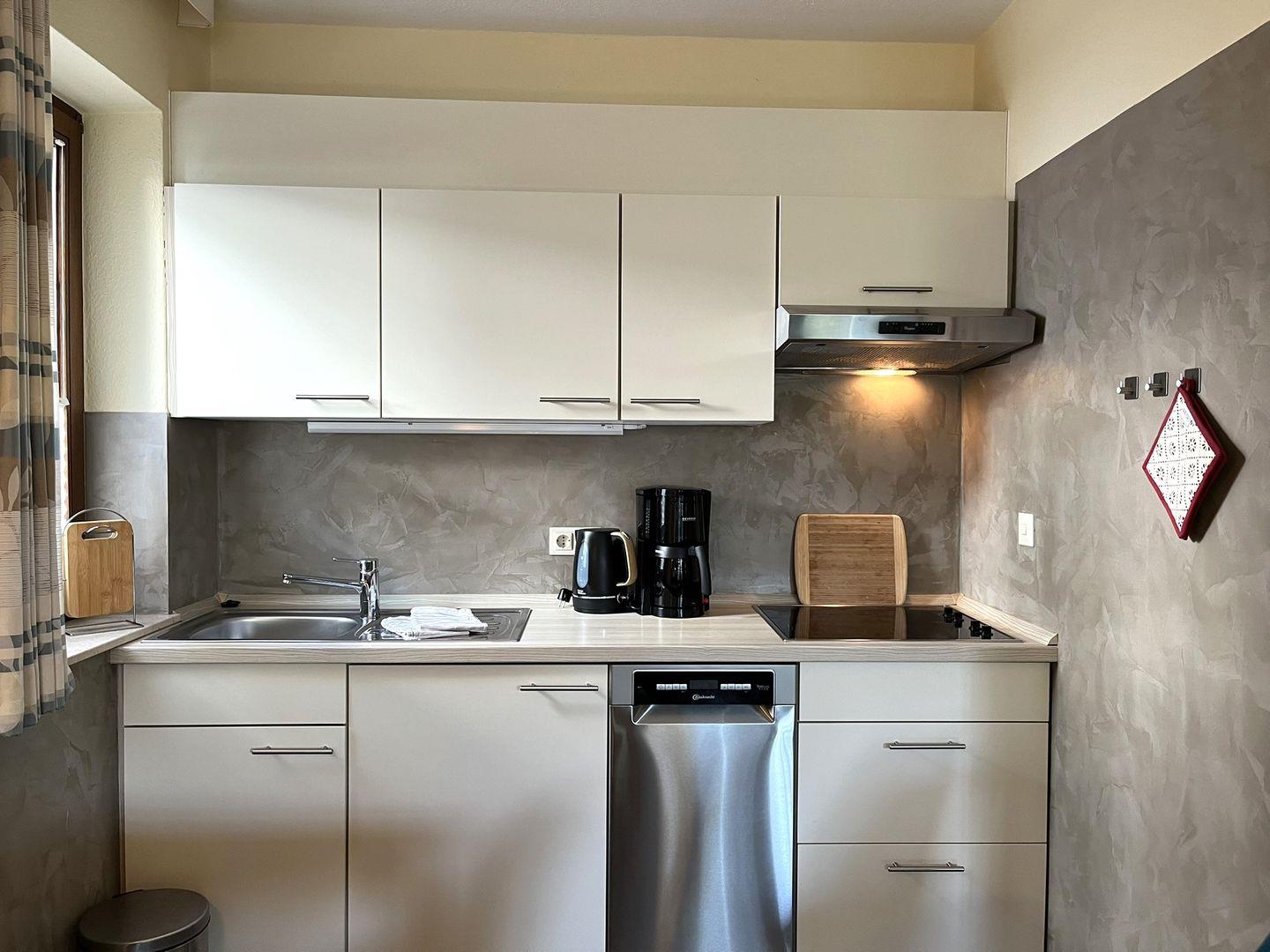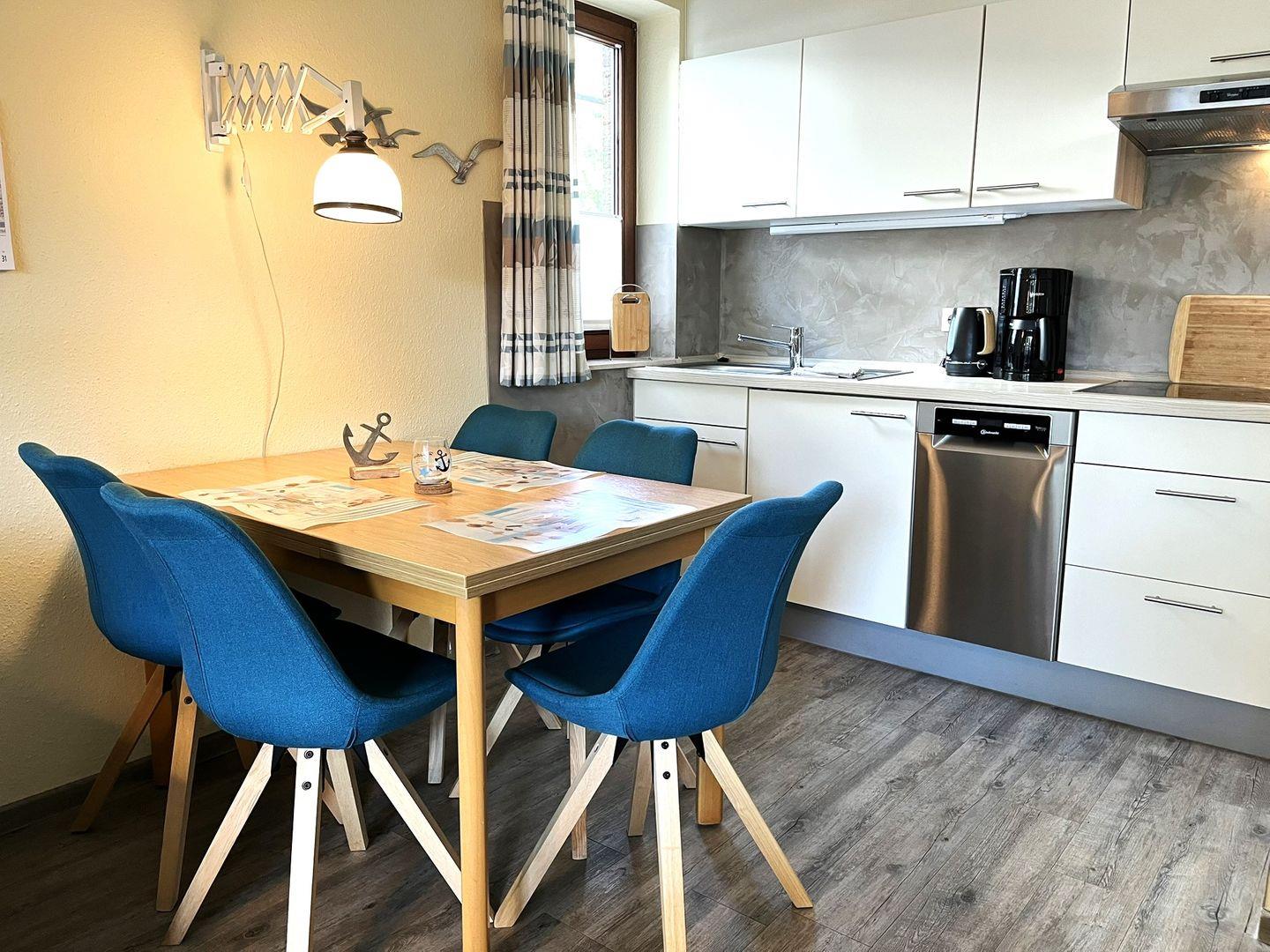 Ebenfalls in dem Raum befinden sich ein Esstisch und die gut ausgestattete Küchenzeile, die unter anderem über eine Geschirrspülmaschine und eine Kaffeemaschine verfügt.