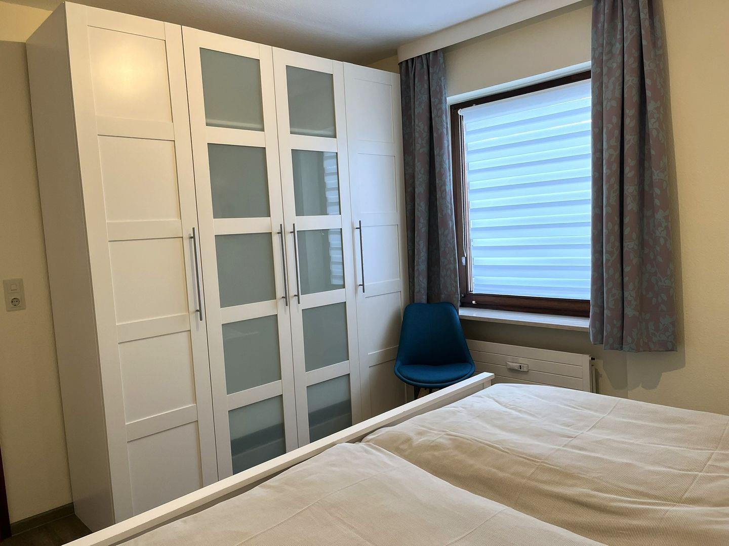 Ein Doppelbett (2 Einzelmatratzen 0,90x 2m) und ein Kleiderschrank, für Ihre Urlaubsgarderobe, befinden sich in dem gemütlichen separaten Schlafzimmer.