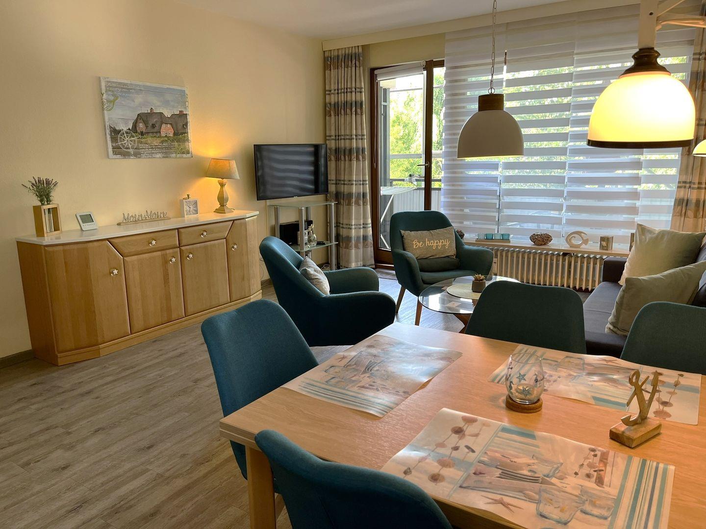 Vom Wohnraum betritt man den möblierten Balkon, auf dem man die gute Luft der nahen Nordsee genießen kann.