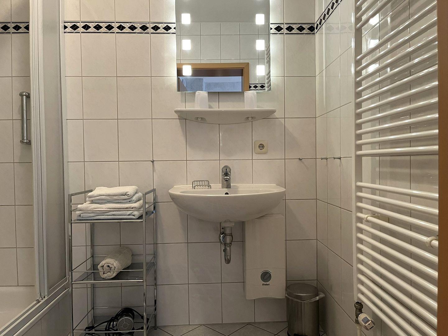 Die Ferienwohnung ist über eine etwas steilere Treppe, eines normalen Wohnhauses, zu erreichen und bietet ein helles und freundliches Wohnzimmer mit Laminatboden, das mit einem gemütlichen Sofa und einem Esstisch ausgestattet ist. Hier können Sie entspannte Abende verbringen oder einfach die Seele baumeln lassen. Angrenzend finden Sie die geschlossene Küche, die mit Cerankochfeld, Kühlschrank mit Gefrierfach, Kaffeemaschine, usw. ausgestattet ist. Eine Mikrowelle befindet sich im Vorflur zur Wohnung und kann gerne genutzt werden.