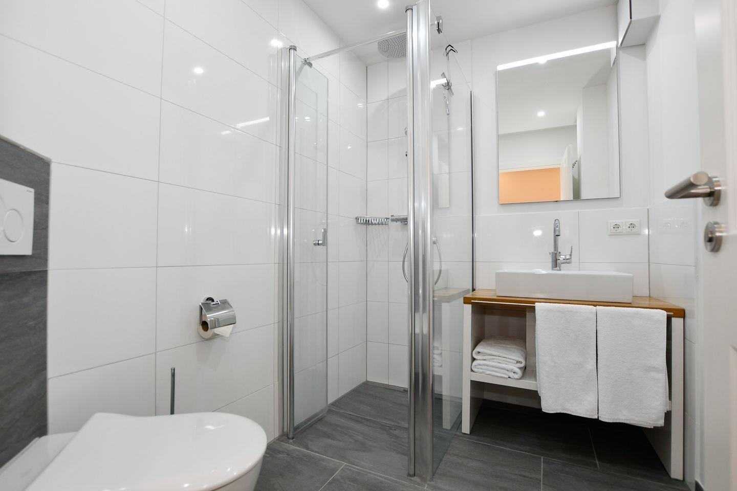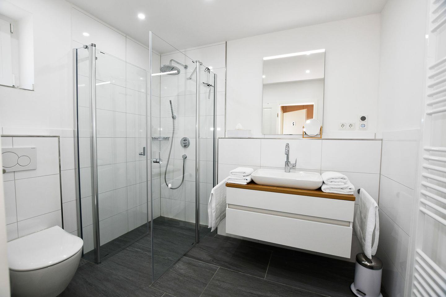 Für Ihr Wohlbefinden sorgt die moderne Badlandschaft mit insgesamt zwei bodengleichen Duschen und WCs. Ein Haartrockner und Kosmetikspiegel sind ebenfalls vorhanden. Sie werden die warmen, einladenden Räume mit Fußbodenheizung und den für Allergiker geeigneten Ausstattungen schätzen, die für ein sicheres und behagliches Gefühl sorgen. Zudem sorgt eine Waschmaschine sowie ein Trockner für zusätzlichen Komfort.