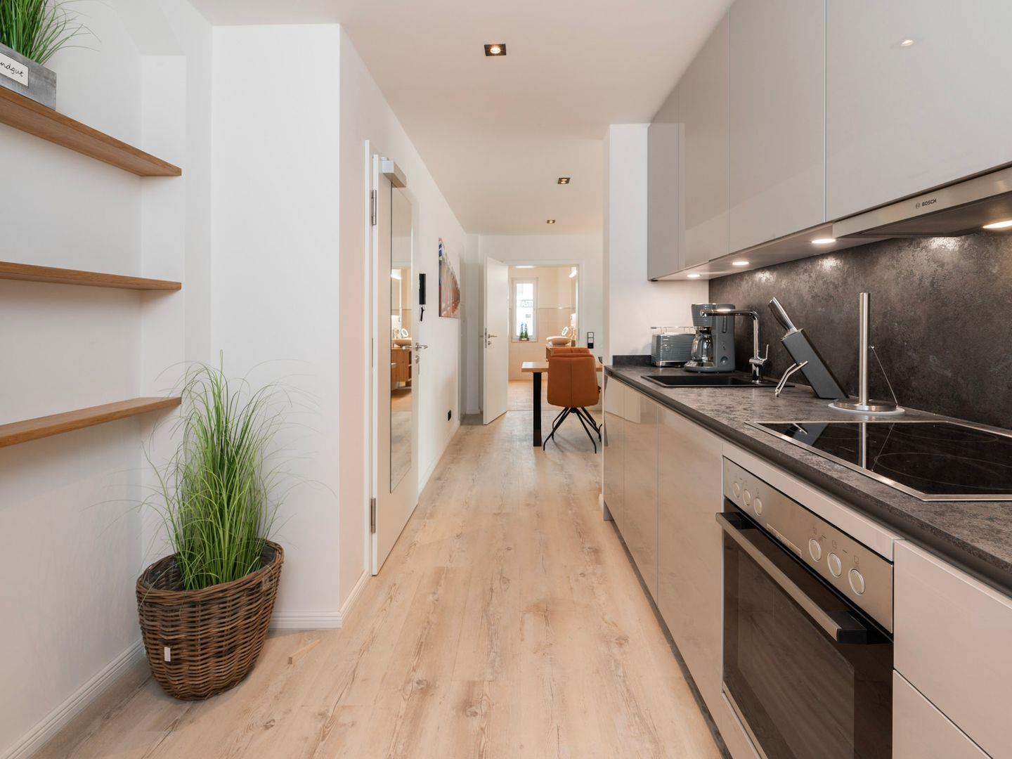Insgesamt bietet die Wohnung zwei gemütliche Schlafzimmer, die für erholsame Nächte sorgen. Der offene Wohnbereich mit einer komfortablen Sofaecke und einem großen Esstisch lädt dazu ein, gesellige Abende zu verbringen und gemeinsame Mahlzeiten zuzubereiten. Die moderne, voll ausgestattete Küche ist mit einem Ceranherd, einem Elektrobackofen, einer Spülmaschine und weiteren Annehmlichkeiten wie einer Kaffeemaschine und einer Nespresso-Maschine ausgestattet – hier können Sie all Ihre kulinarischen Wünsche verwirklichen.