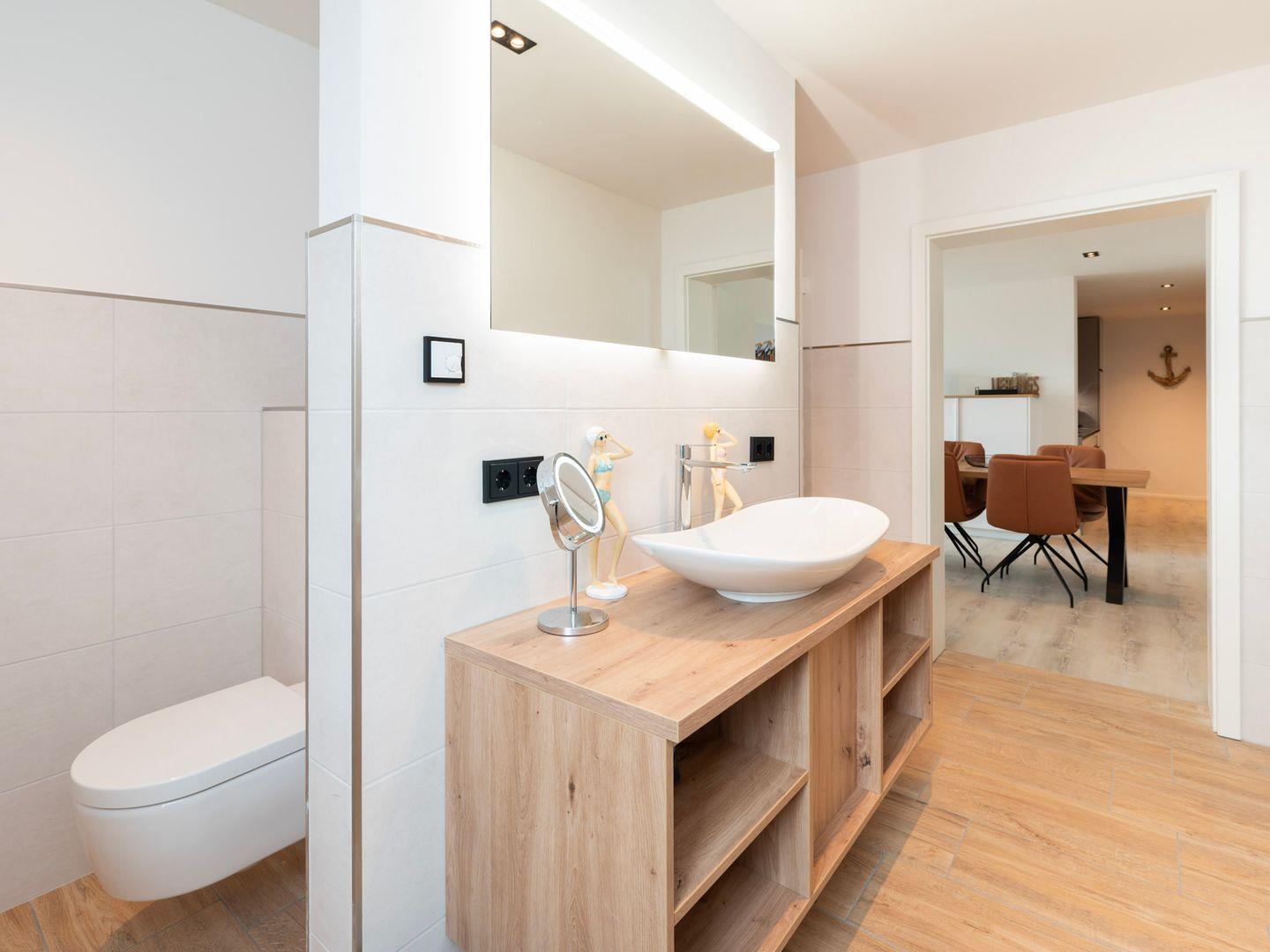 Ein weiteres Highlight der Wohnung ist das stilvolle Badezimmer mit bodengleicher Dusche, Waschbecken, WC und großen Fenstern, die für eine helle Atmosphäre sorgen. Die Fußbodenheizung und die Wärme der Einrichtung schaffen eine wohlige Atmosphäre, die zum Entspannen einlädt. Zusätzlich stehen Ihnen praktische Annehmlichkeiten wie eine Waschmaschine, ein Trockner und kostenfreies WLAN zur Verfügung.