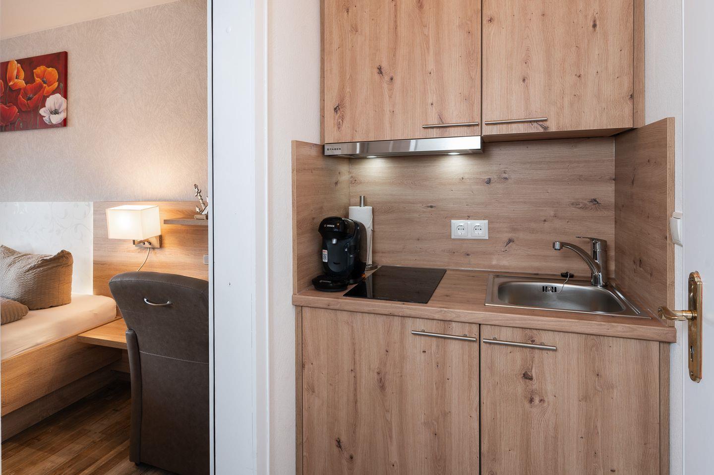 Das Apartment verfügt über ein komfortables Schlafzimmer sowie ein Badezimmer mit Dusche, WC, Waschbecken und Haartrockner. Damit Sie sich wie zu Hause fühlen, ist die Kochnische mit allem ausgestattet, was Sie benötigen – von einem Kühlschrank über Kochutensilien bis hin zu einer praktischen 2-Platten-Herd und einer Espressomaschine. Genießen Sie Ihre selbst zubereiteten Mahlzeiten am Esstisch in der Wohnung oder auf dem eigenen Balkon, der zum Entspannen und Verweilen einlädt.