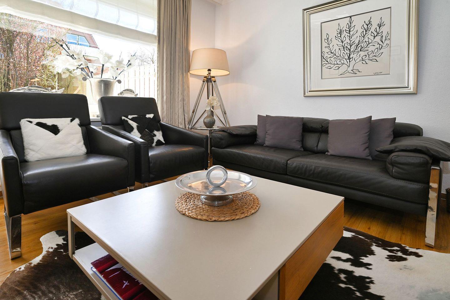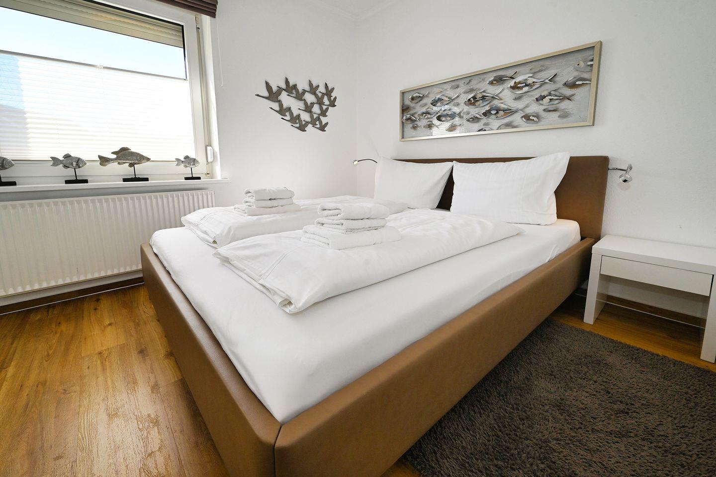 Die Wohnung bietet auf großzügigen 64 m² Platz für bis zu vier Personen. Mit zwei geschmackvoll eingerichteten Schlafzimmern, ausgestattet mit gemütlichen Betten, garantiert sie erholsame Nächte. Der helle Wohnbereich ist offen zur modernen Küche gestaltet, die mit allen Utensilien ausgestattet ist, die Sie für die Zubereitung Ihrer Lieblingsgerichte benötigen. Hier finden Sie unter anderem einen Herd, einen Backofen, eine Mikrowelle, eine Spülmaschine und eine Kaffeemaschine. Der Esstisch lädt zu gemeinsamen Mahlzeiten ein und schafft ein familiäres Ambiente.