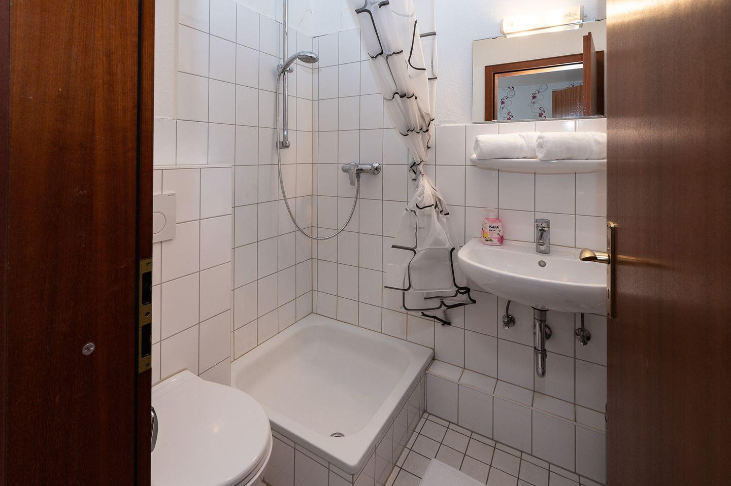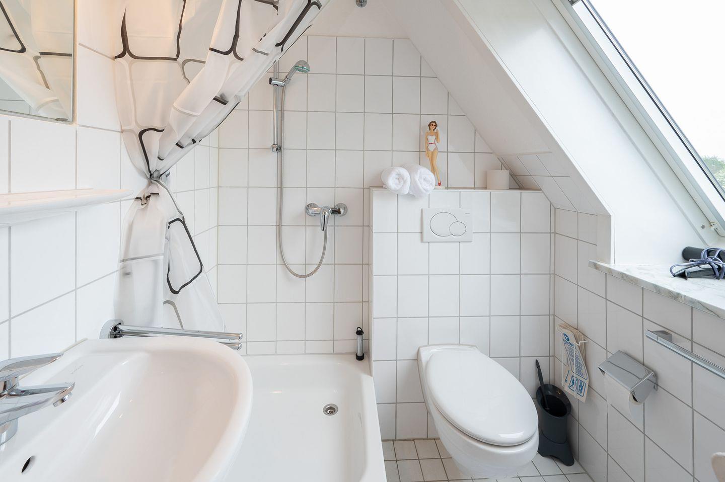 Wenn Sie sich nach einem aufregenden Tag an der Küste entspannen möchten, lässt die Dusche in Ihrem Badezimmer keine Wünsche offen. Ausgestattet mit einem Haartrockner, WC, Waschbecken und Spiegel, ist es der ideale Ort, um sich nach einem Tag in der Natur zu erfrischen.