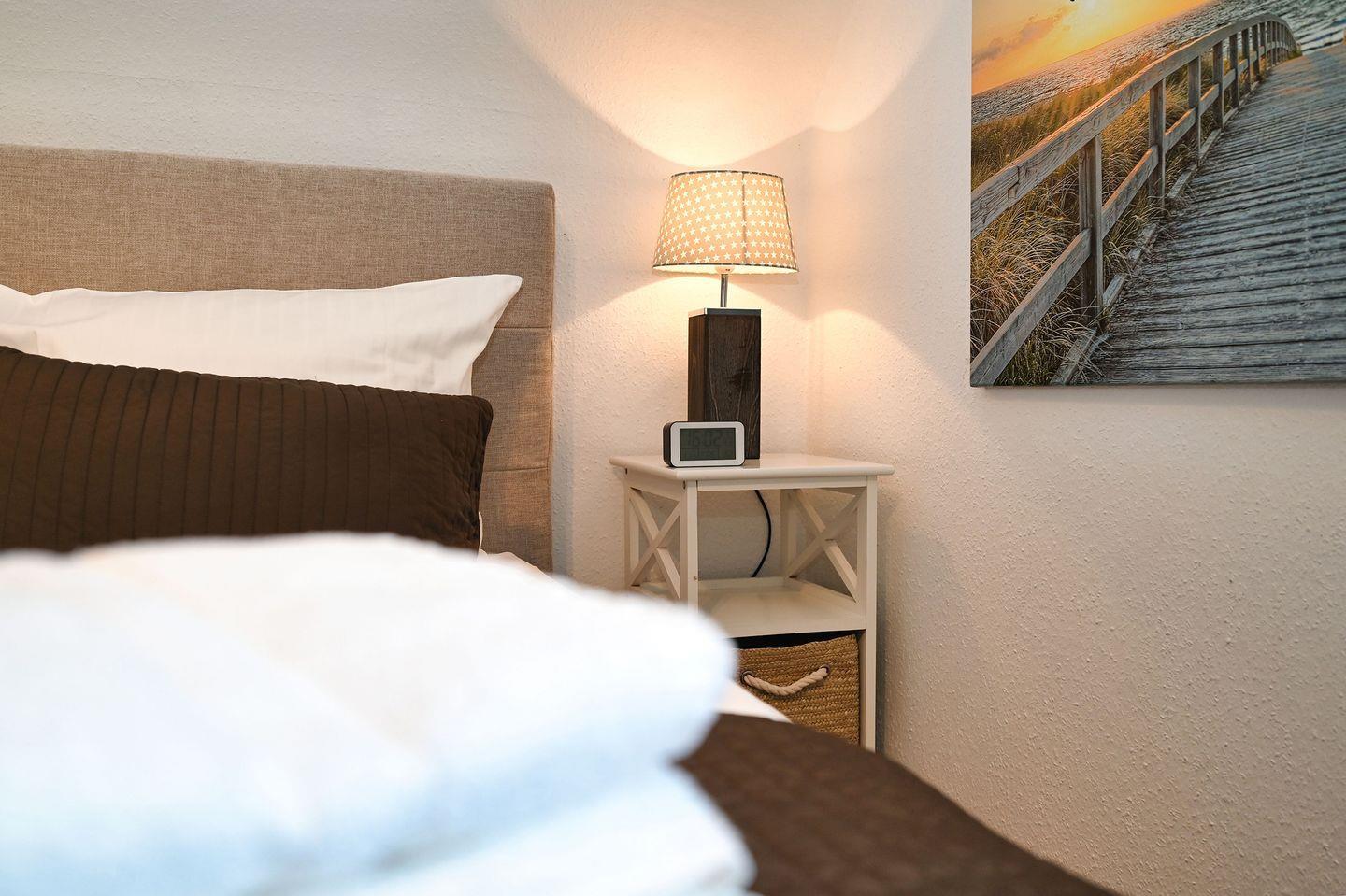 Das Schlafzimmer ist mit einem gemütlichen Doppelbett ausgestattet und verfügt über ausreichend Stauraum für Ihre Kleidung. In dem hellen, modern gestalteten Badezimmer finden Sie eine Dusche, in der Sie sich nach einem aufregenden Tag entspannen können. Waschmaschine und Trockner stehen für gemeinschaftliche Nutzung zur Verfügung und sorgen dafür, dass Sie im Urlaub nicht auf den gewohnten Komfort verzichten müssen.