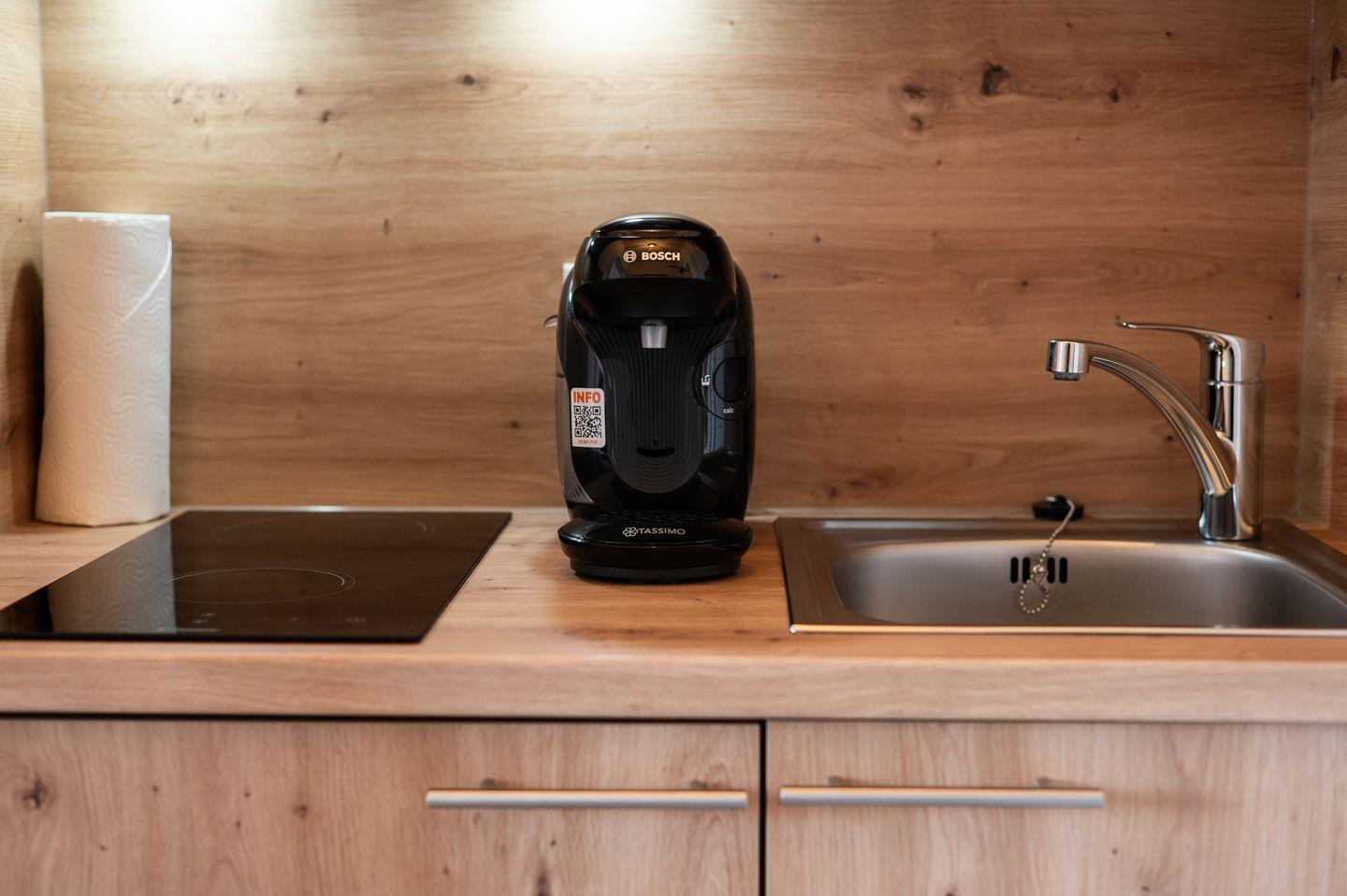 Die Kochnische ist mit allem Notwendigen ausgestattet, darunter ein Kühlschrank, ein 2-Platten-Herd und eine moderne Espressomaschine der Marke Tassimo, um Ihre Sehnsucht nach Kaffee zu stillen. Genießen Sie Ihre Mahlzeiten am Esstisch oder auf dem Balkon mit Blick auf die Umgebung – der perfekte Ort, um den Tag mit einem Frühstück in der dänischen Sonne zu beginnen!