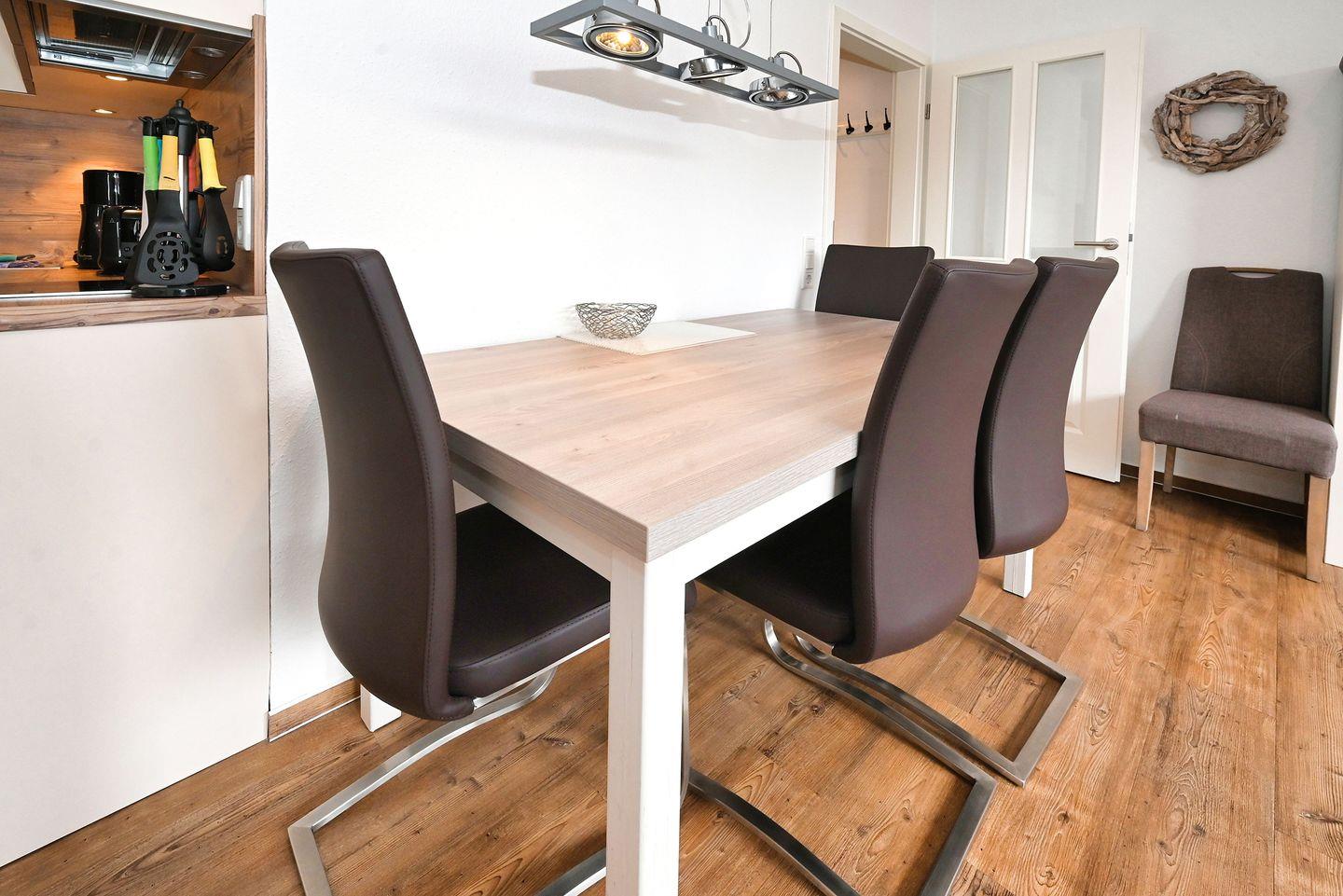 Die 35 m² große, allergikergeeignete Ferienwohnung verfügt über ein gemütliches Schlafzimmer, in dem bis zu drei Personen komfortabel schlafen können. Genießen Sie nach einem erlebnisreichen Tag am Strand erholsame Nächte und wachen Sie erfrischt auf. Das offene Wohnkonzept, das die Küche und das Wohnzimmer vereint, schafft eine einladende Atmosphäre, in der Sie sich sofort wohlfühlen werden. Die moderne Küche ist voll ausgestattet mit allem, was Sie für die Zubereitung Ihrer Lieblingsgerichte benötigen, einschließlich einer Spülmaschine, einem Cerankochfeld und einem Kühlschrank mit Gefrierfach. Genießen Sie Ihre Mahlzeiten am Esstisch oder auf dem Balkon, während Sie die frische Seeluft und die ruhige Umgebung schätzen.