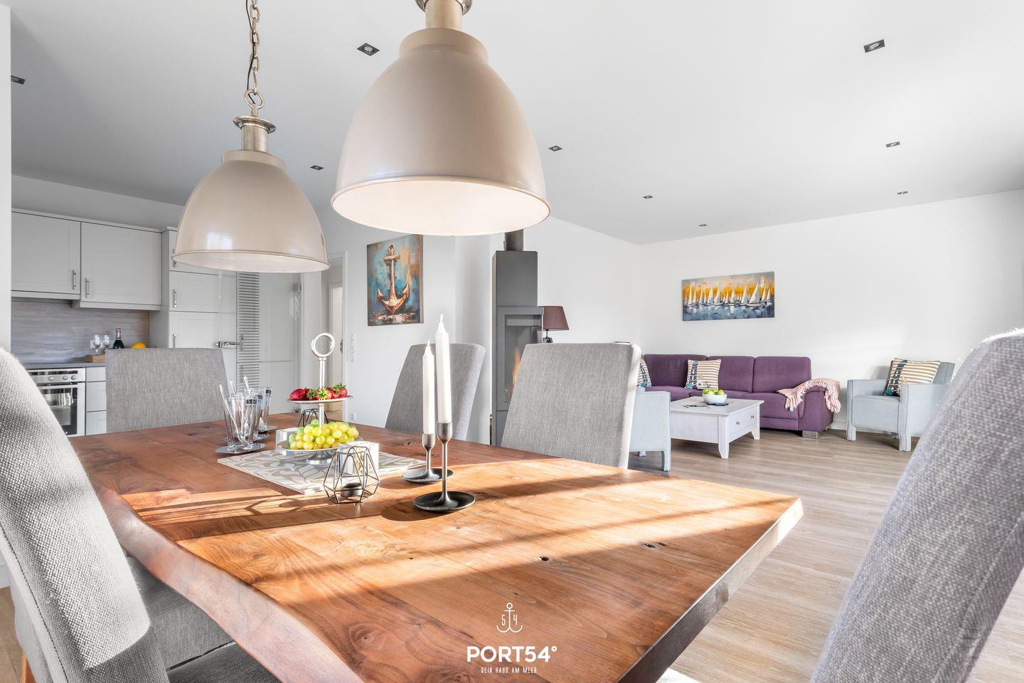 Die offene und voll ausgestattete Küche ist ein Traum für jeden Hobbykoch. Sie verfügt über moderne Geräte wie einen Cerankochfeld, einen Backofen, eine Mikrowelle und eine Spülmaschine. Gemeinsam am Esstisch kann das Frühstück oder das Abendessen genossen werden, während der offene Wohnbereich zum Verweilen einlädt. Ausgestattet mit einer bequemen Sofaecke, einem Kaminofen für gemütliche Abende und einem großen Fernseher, wird jede freie Minute zum Genuss.