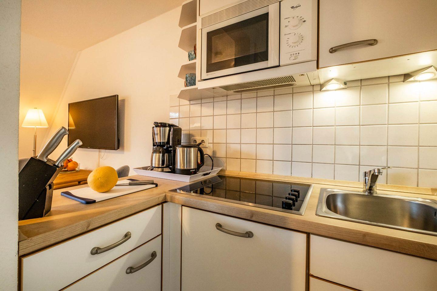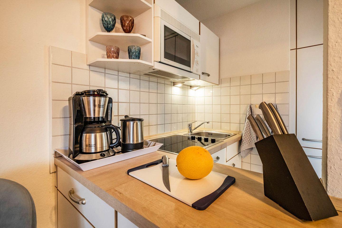 Die offene Küche ist komplett ausgestattet und lässt keine Wünsche offen. Hier findet ihr einen Herd mit Ceranfeld, eine Spülmaschine, sowie alle notwendigen Küchenutensilien. Ein Kühlschrank, eine Mikrowelle, ein Wasserkocher, ein Toaster und eine Kaffeemaschine sind ebenfalls vorhanden, sodass Sie sich im Handumdrehen selbst versorgen können. Das Badezimmer ist praktisch eingerichtet mit Dusche, einem WC, Waschbecken und Spiegel. Selbstverständlich steht Ihnen auch ein Haartrockner zur Verfügung.