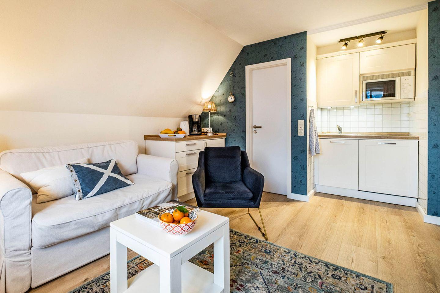 Das Apartment befindet sich im 1. Stock und überzeugt mit einer offenen Küchen- und Wohnlandschaft. Die gut ausgestattete Küche lässt keine Wünsche offen: Hier finden Sie einen Herd, eine Spülmaschine, eine Mikrowelle sowie eine Kaffeemaschine, um nach einem erholsamen Schlaf den perfekten Start in den Tag zu genießen. Ein Esstisch und eine Sofaecke laden zu gemeinsamen Mahlzeiten und entspannten Stunden ein. Der Fernseher und das WLAN sorgen zudem für Unterhaltung und eine stets gute Verbindung zur Außenwelt.