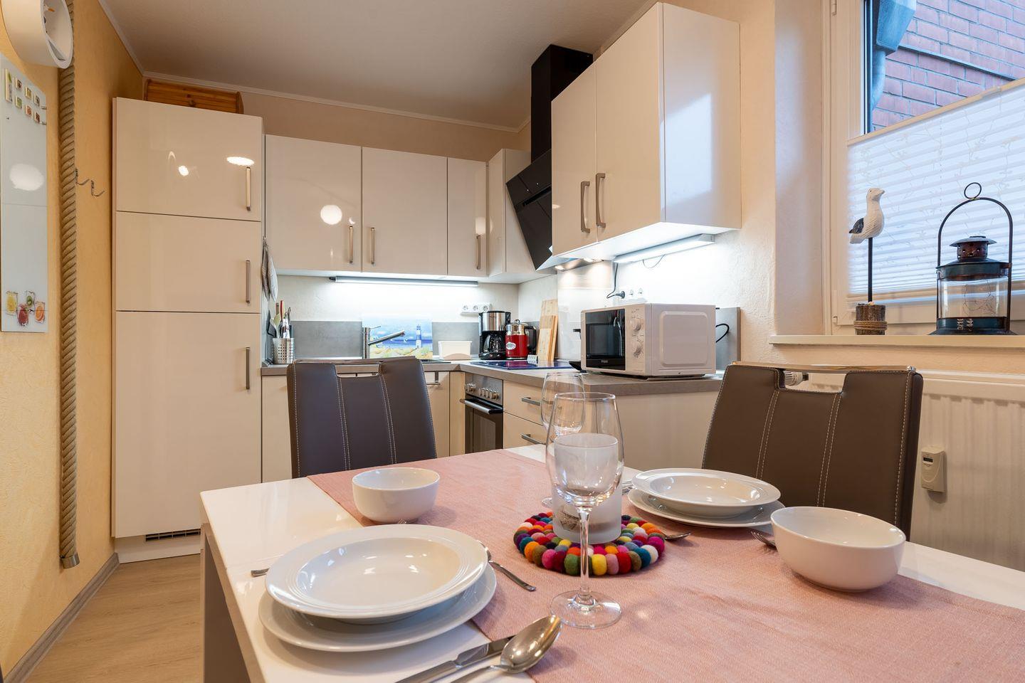 Einbauküche: Vollständig ausgestattet mit Herd, Kühlschrank, Mikrowelle, Kaffeemaschine und allem, was Sie zum Kochen benötigen.