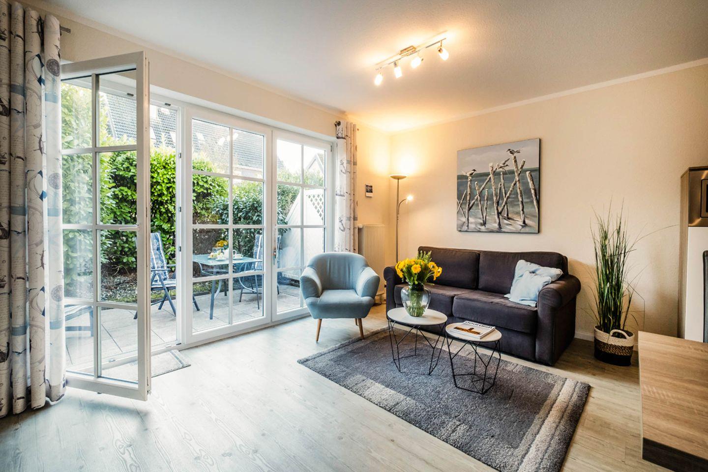 Der Bungalow zeichnet sich durch eine moderne, offene Raumgestaltung aus. Der einladende Wohnbereich ist mit einem komfortablen Sofa, einem Sessel und einem Esstisch ausgestattet, der ausreichend Platz für gemeinsame Mahlzeiten bietet. Für Ihre Unterhaltung stehen Ihnen zwei Fernseher sowie eine HiFi-Stereoanlage mit CD, DAB+/FM-Radio, USB und Bluetooth + WLAN zur Verfügung, sodass Sie sich nach einem erlebnisreichen Tag entspannen und die Abende in gemütlicher Runde genießen können.