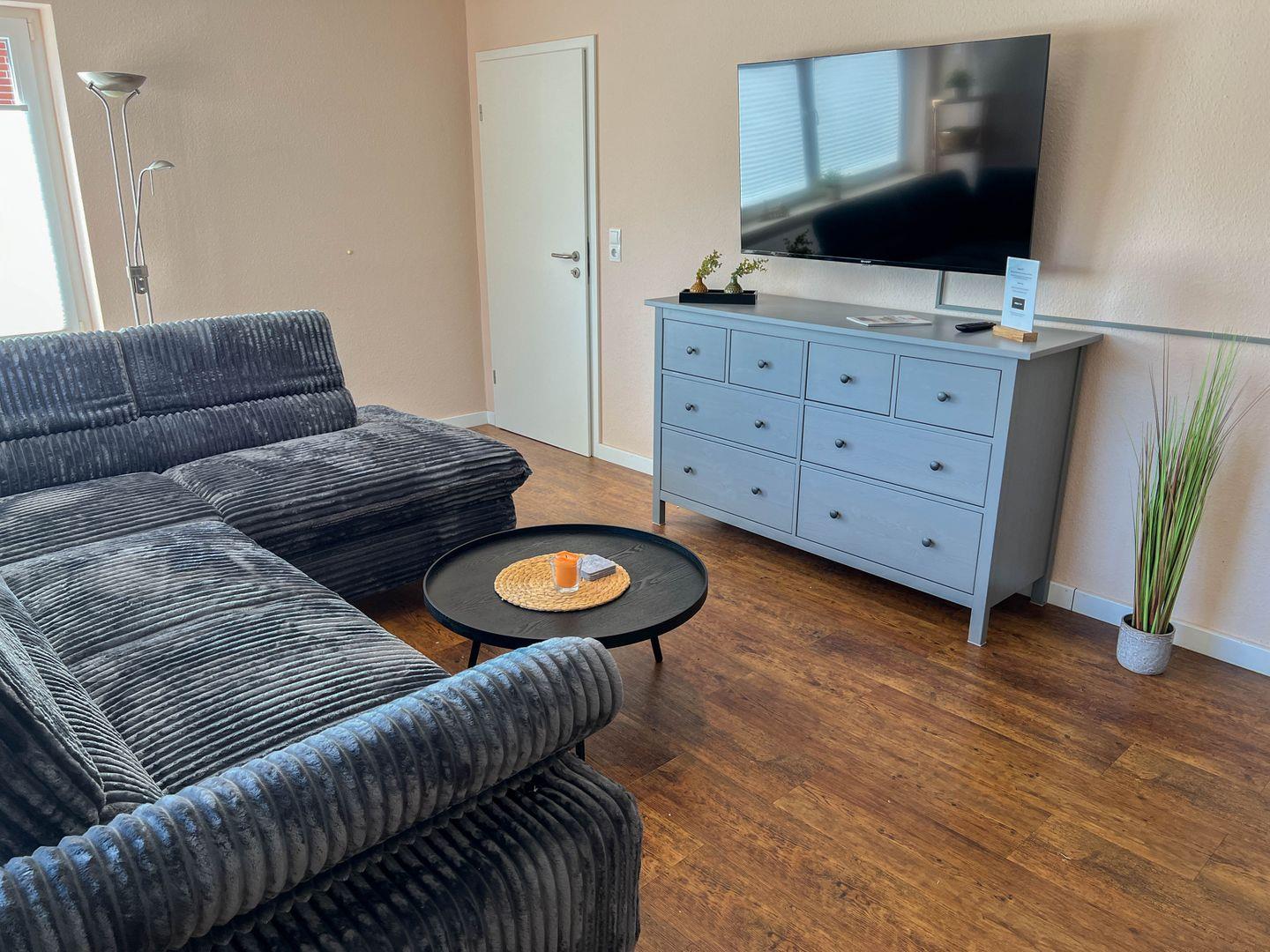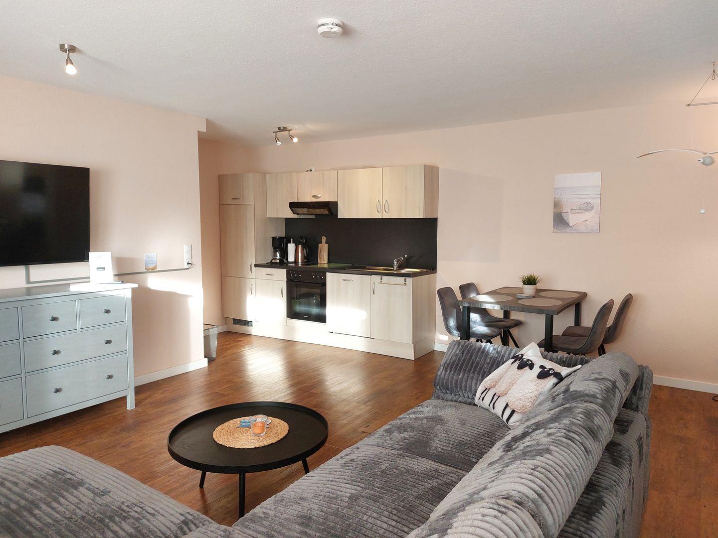 Das Wohnzimmer ist der perfekte Ort, um nach einem langen Tag am Strand zu entspannen. Genießen Sie die bequemen Sessel und das Sofa, während Sie die neuesten Filme auf dem Fernseher ansehen oder einfach nur eine Radio-Sendung hören. Kostenloses WLAN sorgt dafür, dass Sie auch im Urlaub mit der Außenwelt verbunden bleiben können. Die große Sonnenterrasse (Süd-Ost-Lage) lädt dazu ein, die frische Nordsee-Luft und den Blick auf die Umgebung zu genießen.