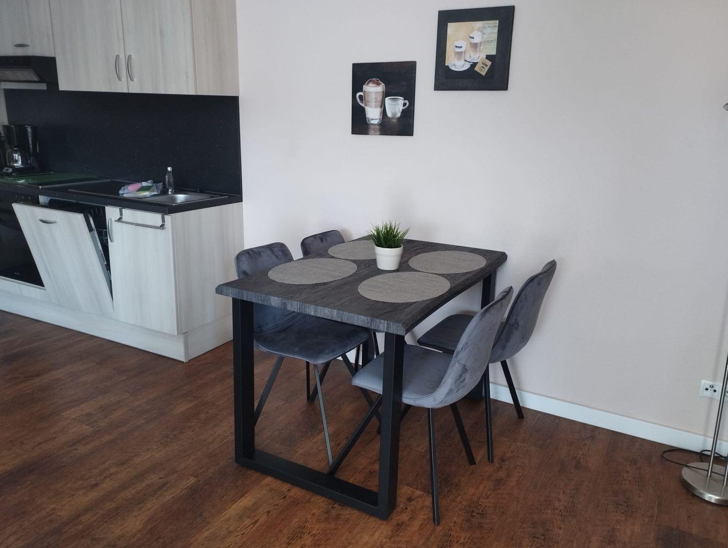 Der offene Küchenbereich, der elegant mit dem Esszimmer (inkl. Esstisch) und dem Wohnzimmer verbunden ist, ist mit erstklassigen Küchengeräten ausgestattet, darunter ein Ceran-Herd, ein Backofen, ein Kühlschrank, eine Spülmaschine und eine Mikrowelle – alles, um Ihnen das Zubereiten Ihrer Lieblingsgerichte zu erleichtern. Geschirr, Besteck, Küchenutensilien und eine Kaffeemaschine runden dieses Angebot ab, damit Sie sich wie zu Hause fühlen.