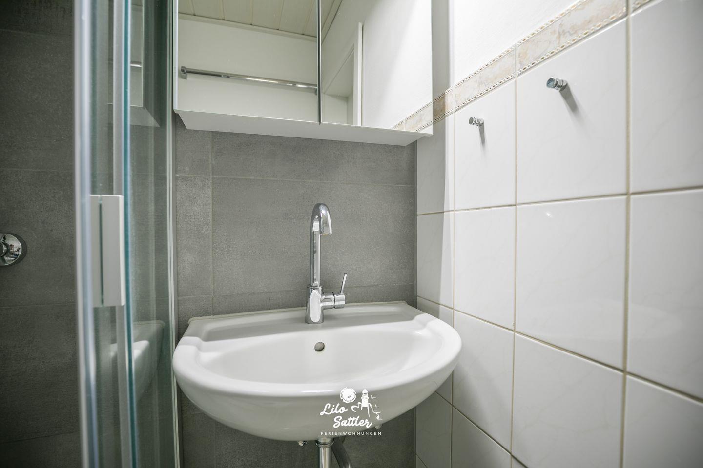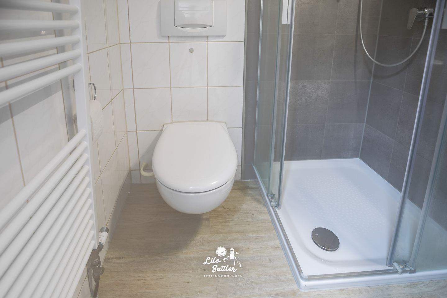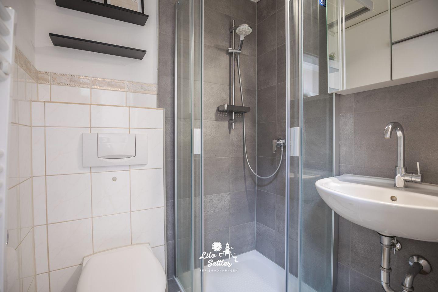 Bodentiefe Dusche, WC, Waschbecken, Spiegelschrank, Handtuchwärmer, Abluft