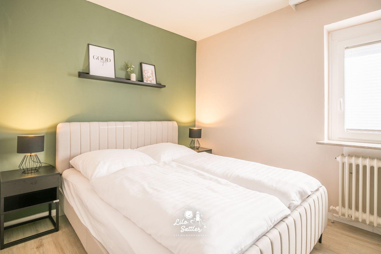Doppelbett (0,80cm x 2,00m), Nachttische + Lampen, Fenster mit Plissee und Außenrollo, Flachbild-Smart-TV